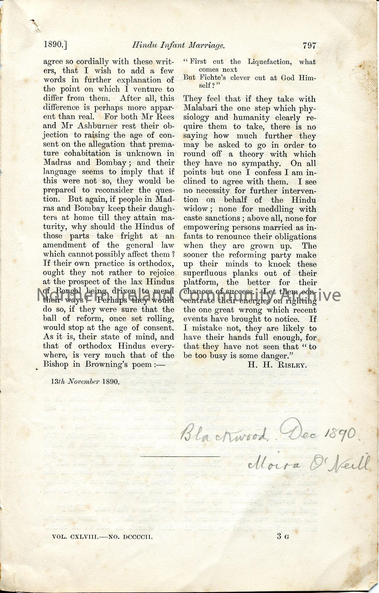 Page from a book, chapter titled, ‘Born on Hallow E’en’. December 1890, Moira O’Neill. Pages 797-798.