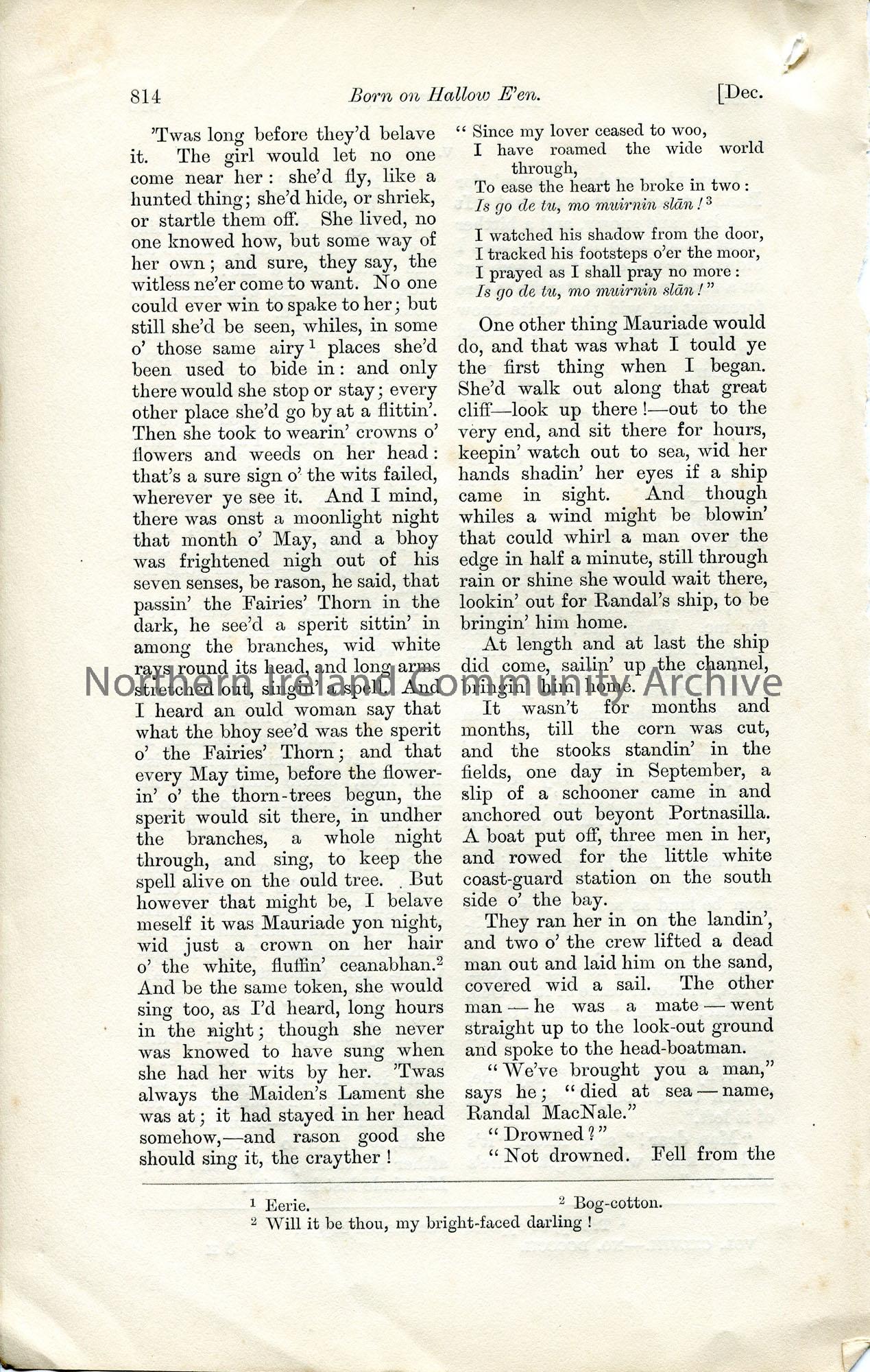 Page from a book, chapter titled, ‘Born on Hallow E’en’. December 1890, Moira O’Neill. Pages 813-814. – scan021b