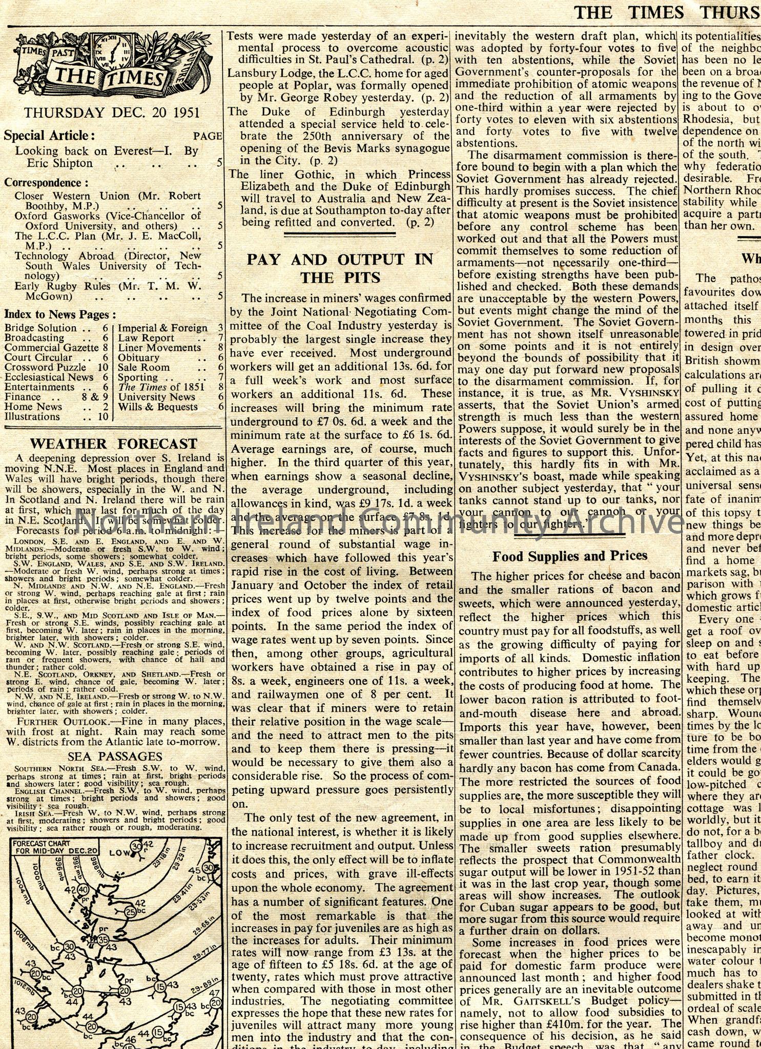 Page from ‘The Times’ newspaper. Dated Thursday 20th December, 1951. Articles re general news articles and Imperial and Foreign news.