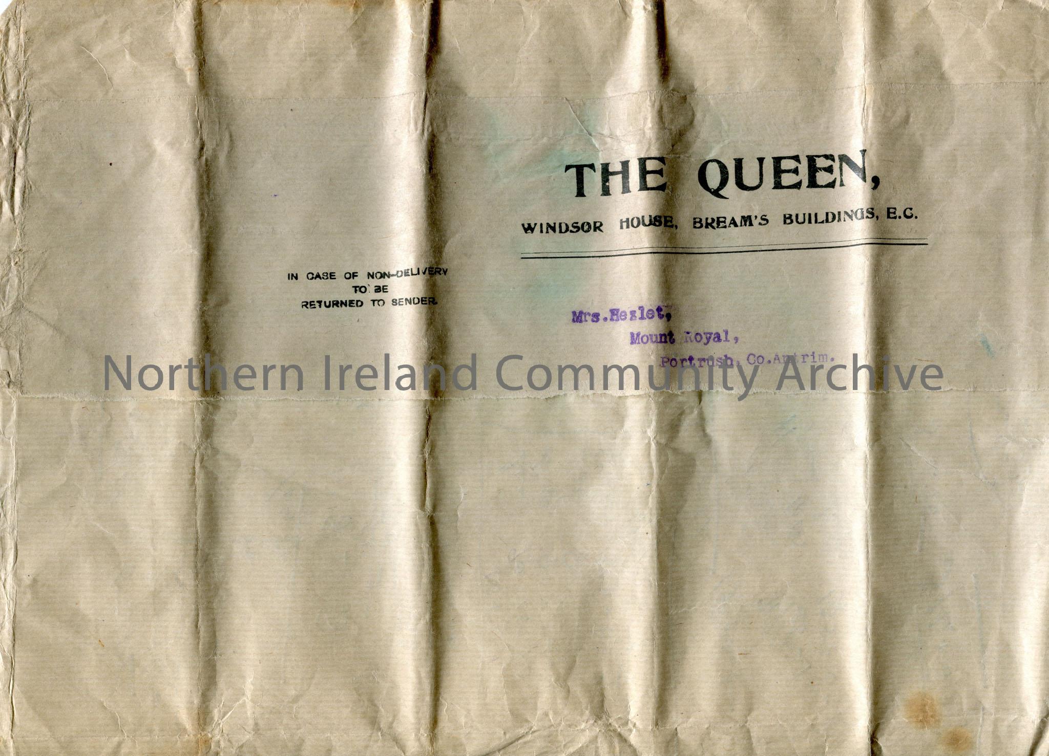 Page of handwritten rough calculations in pencil. Notes are written on the back of possibly parcel packaging which has 'The Queen' Windsor House, Bream's Buildings, E.C and 'Mrs. Hezlet, Mount Royal, Portrush, Co.Antrim' on packaging.