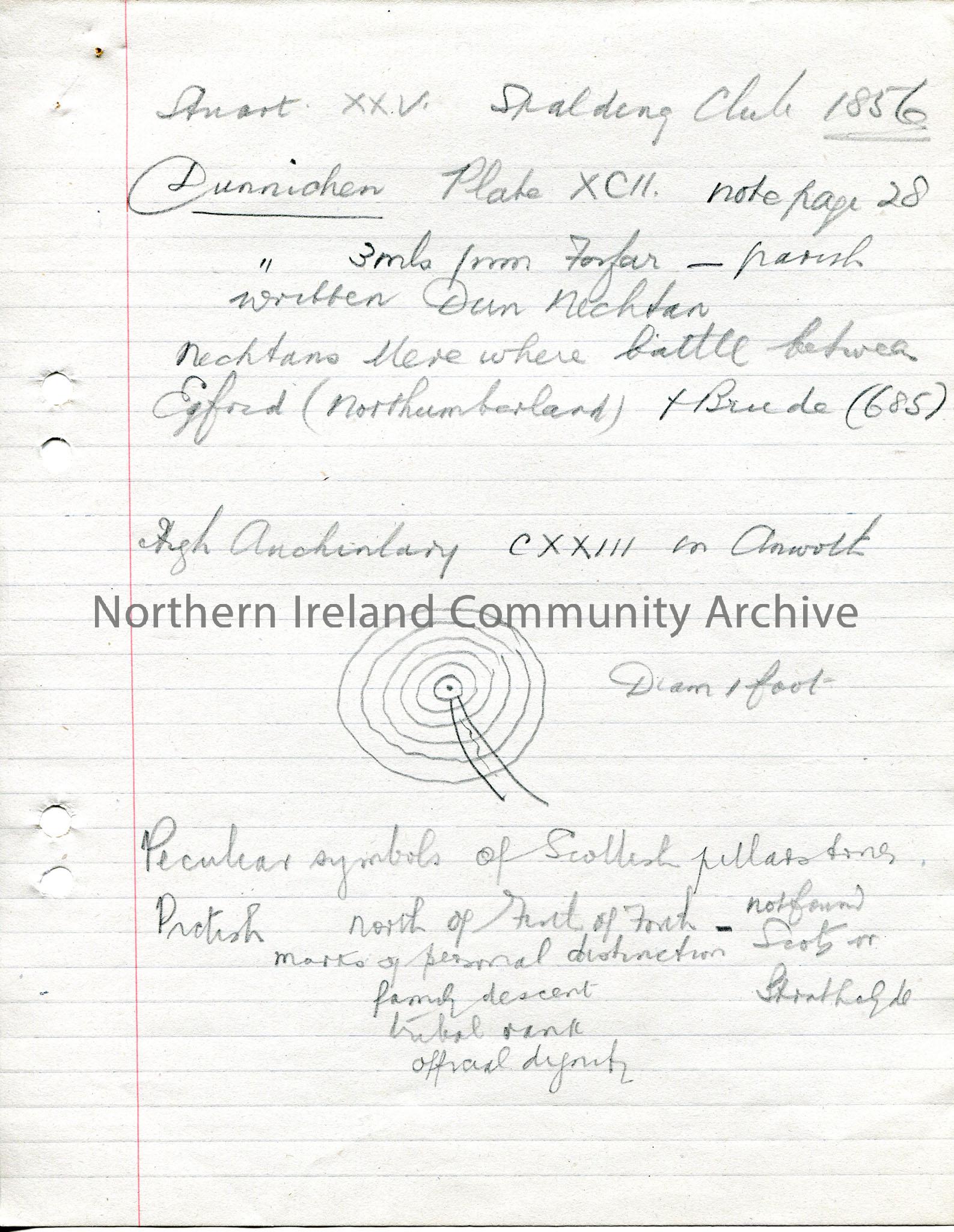 Page of handwritten rough notes - 1 of 5 pages of notes under initial heading Cross Ni Naghan - cross in Glenravel, originated in Highlands of Scotland, removed to ? Layde Church. Mentions decoration of crosses - symbols and meanings - 'Peculiar symbols of Scottish pillar stones'