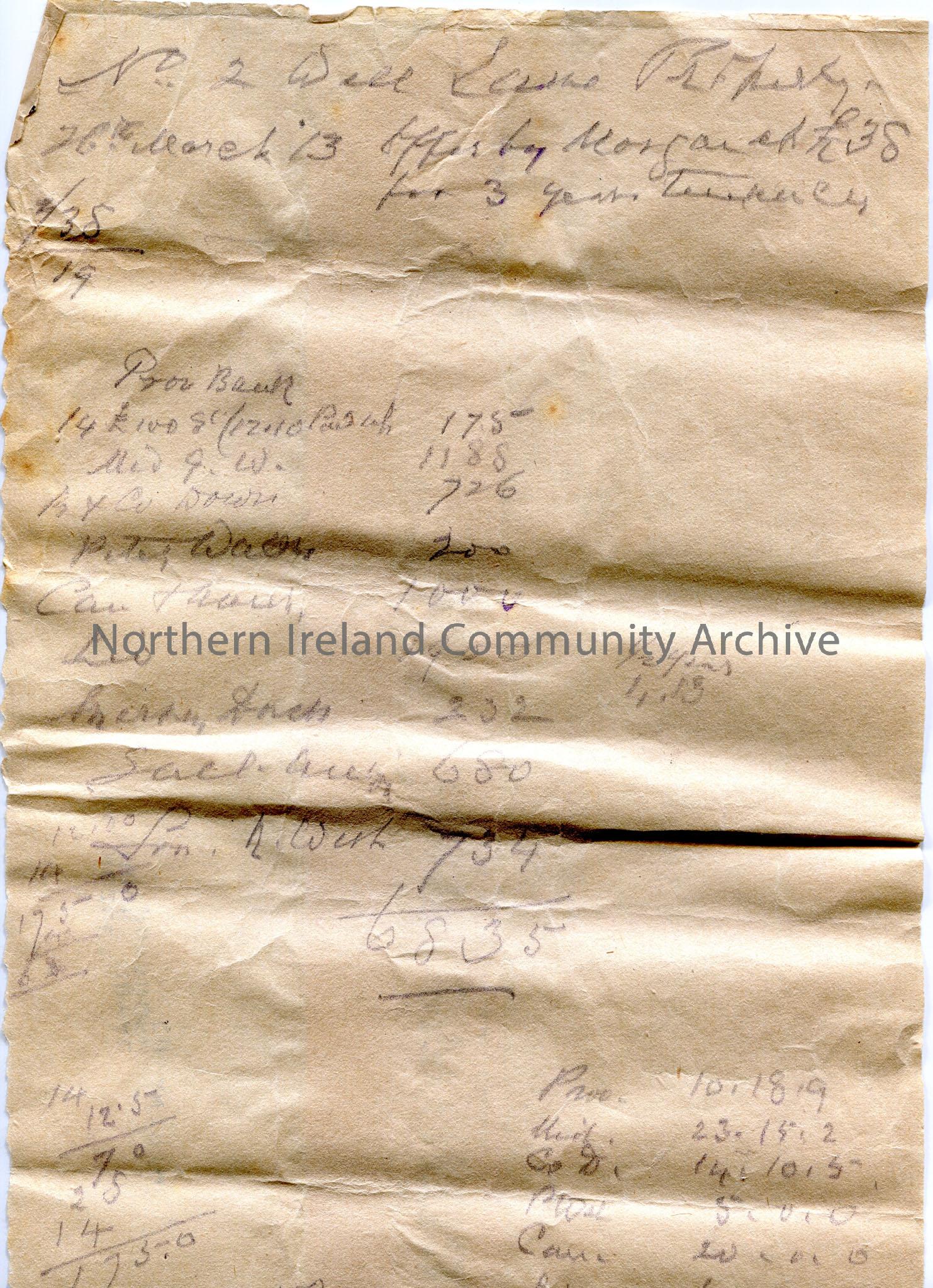 Page of handwritten rough notes and balances of accounts in pencil. 'No 2 Will Lake property. 26th March '13 offers by Morgan at £38 for 3 years tenancy. Notes are written on the back of possibly parcel packaging which has 'The Gentlewoman' and 'RS. Hezlet, Mount Royal, Portrush, Co.Antrim' on packaging. Red George V 1d postage stamp, dated 12th January '16.