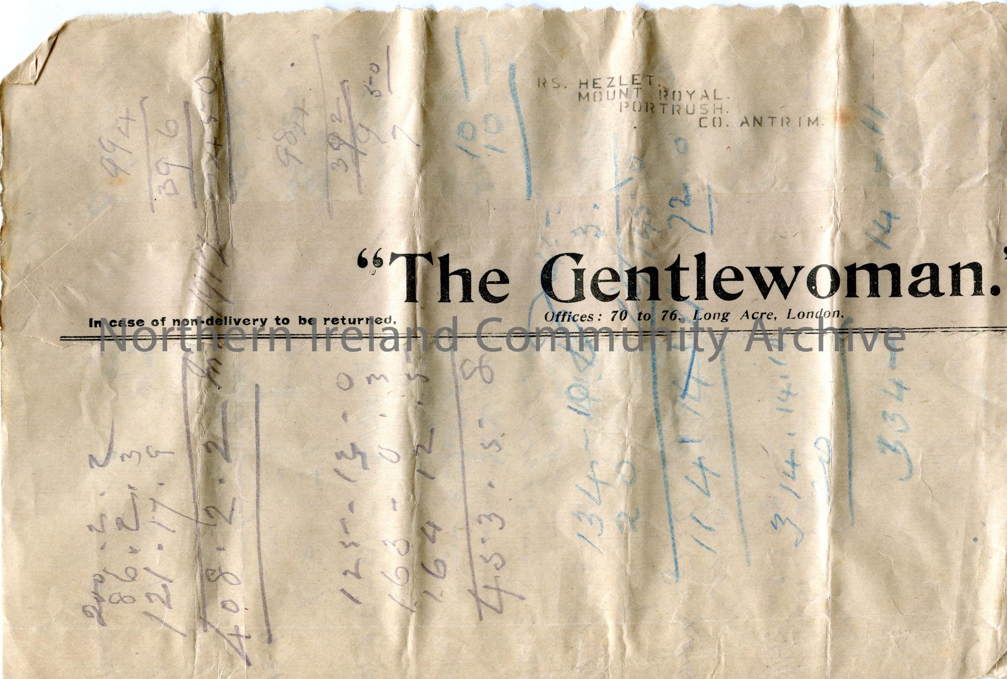 Page of handwritten rough notes and balances of accounts in pencil. Rough calculations on one side. Unclear whether it is credits, debits or both. Dates are related to 1915. Notes are written on the front and back of possibly parcel packaging which has 'The Gentlewoman' and 'RS. Hezlet, Mount Royal, Portrush, Co.Antrim' on packaging.
