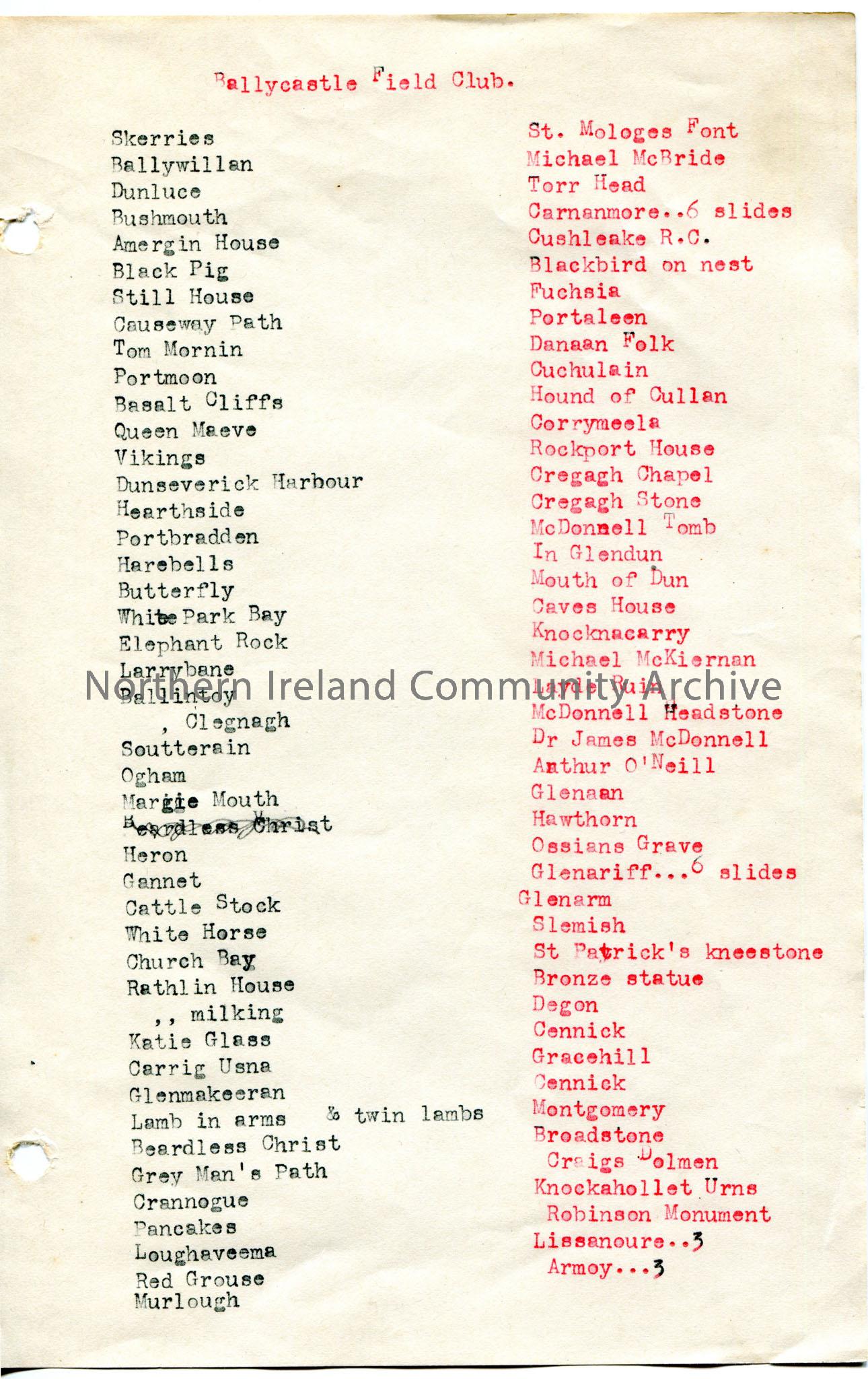 Page of two typed lists, possibly of slides for lecture. Titled, 'Ballycastle Field Club'. List on left side is typed in black, right side typed in red.