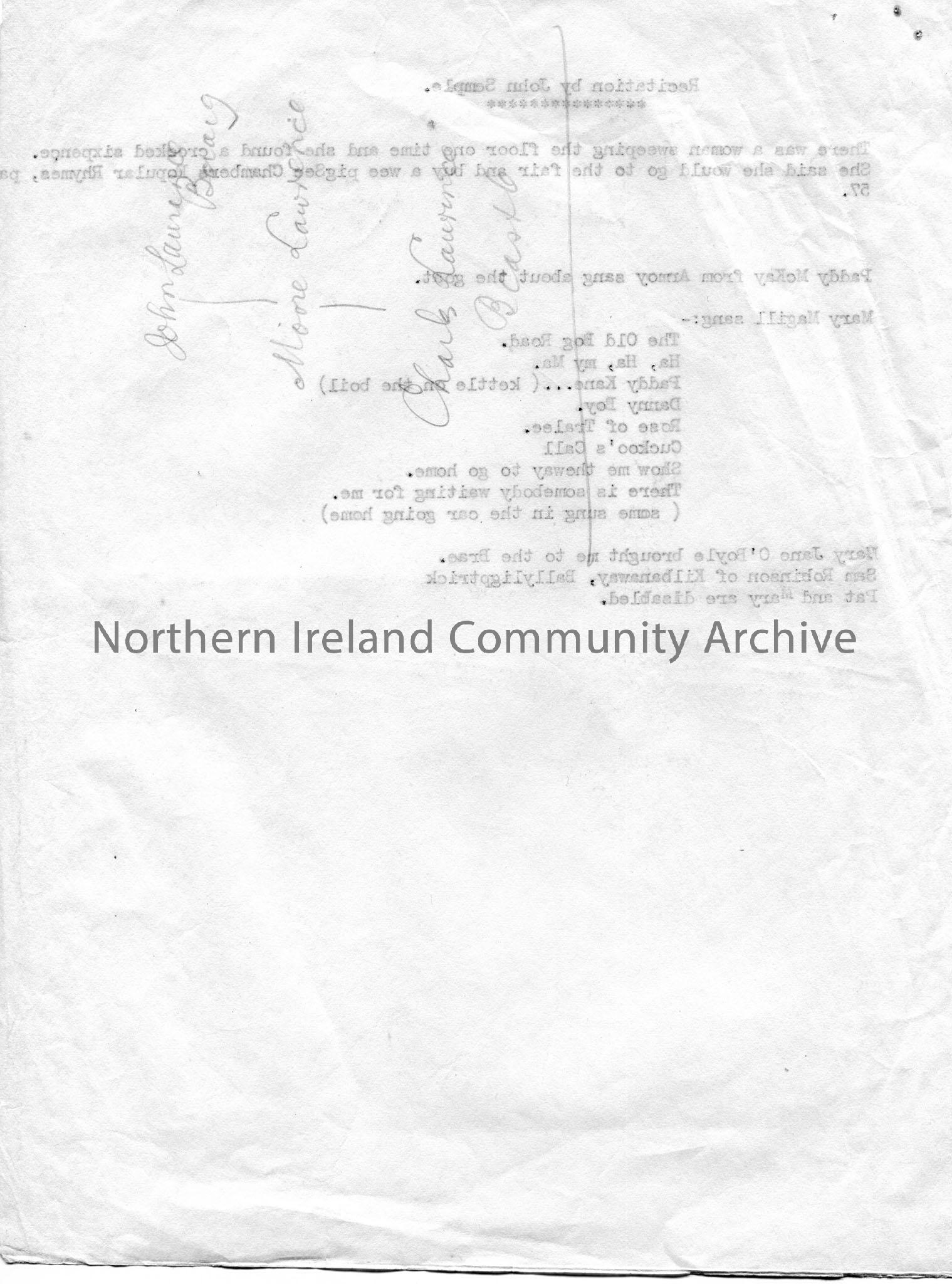Page of typed notes re recitation by John Semple, as woman going to the fair, Chambers Popular Rhymes; list of songs sang by Mary Magill. Part of family tree of Lawrence family on reverse handwritten in pencil.
