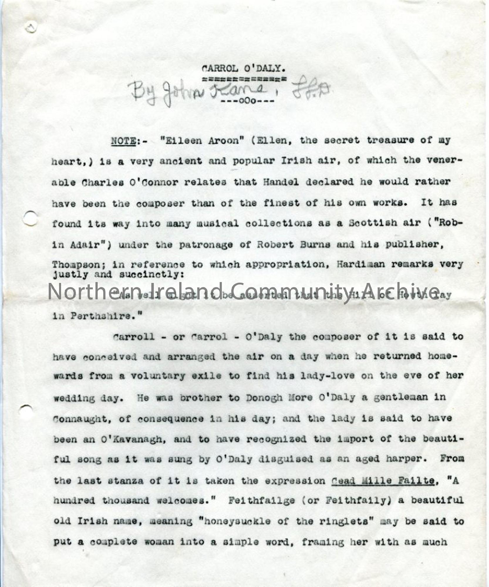 Page one: typed page re: 'Carrol O'Daly' and the air 'Eileen Aroon', along with the words to the song. A popular Irish air, sometimes regarded as a Scottish air.