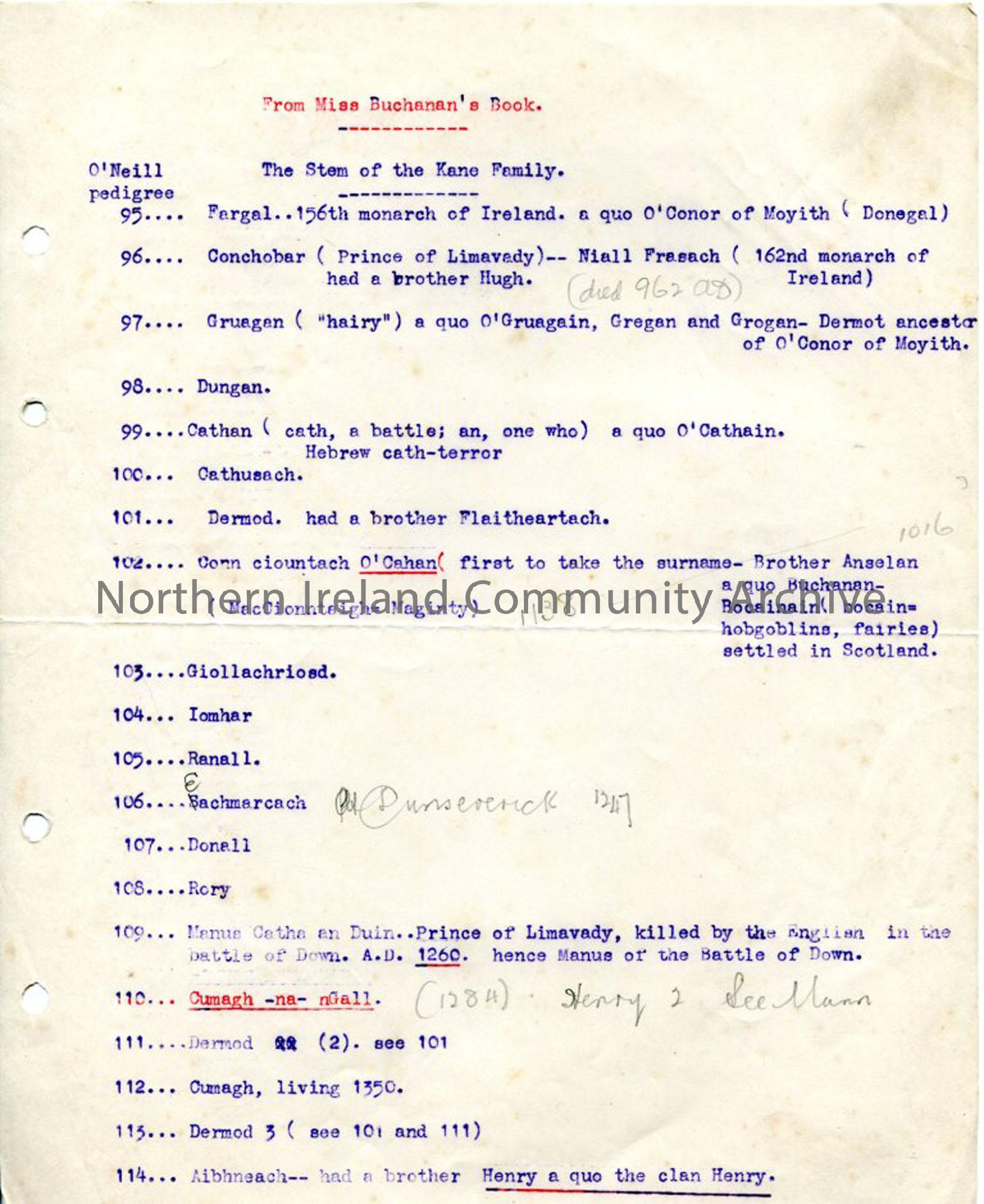 Page One of 2 pages of typed notes re: Kane (O'Cahan) lineage from medieval times until 18th century. 'From Miss Buchanan's Book'