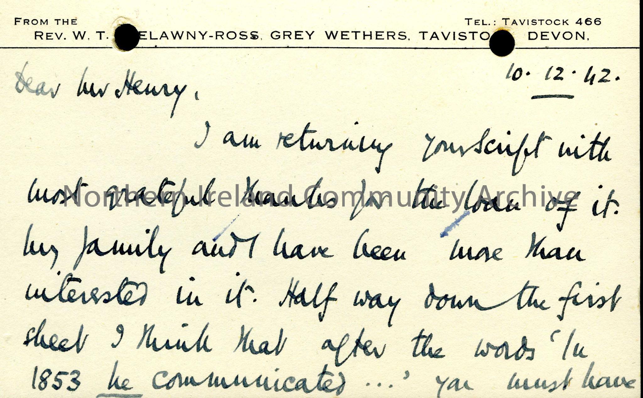 Page one of a card sent to Sam thanking him for his article. The article seems to have been about Miss Jane Ross of Limavady, the great aunt of the correspondent, Rev. W. T. Trelawny-Ross.