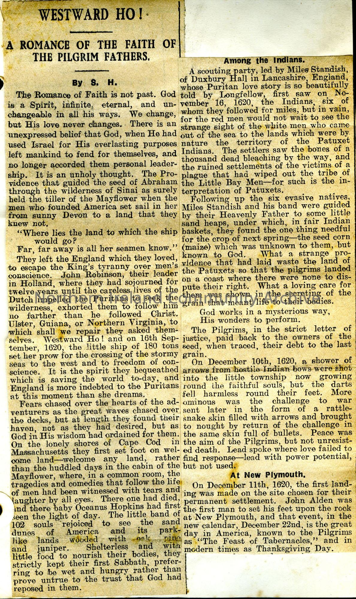 page one of article titled, 'Westward Ho! A Romance of the Faith of the Pilgrim Fathers', by Sam Henry. Subtitles include 'Among the Indians', 'At New Plymouth' and 'Squanto-Friend of the Pilgrims'.