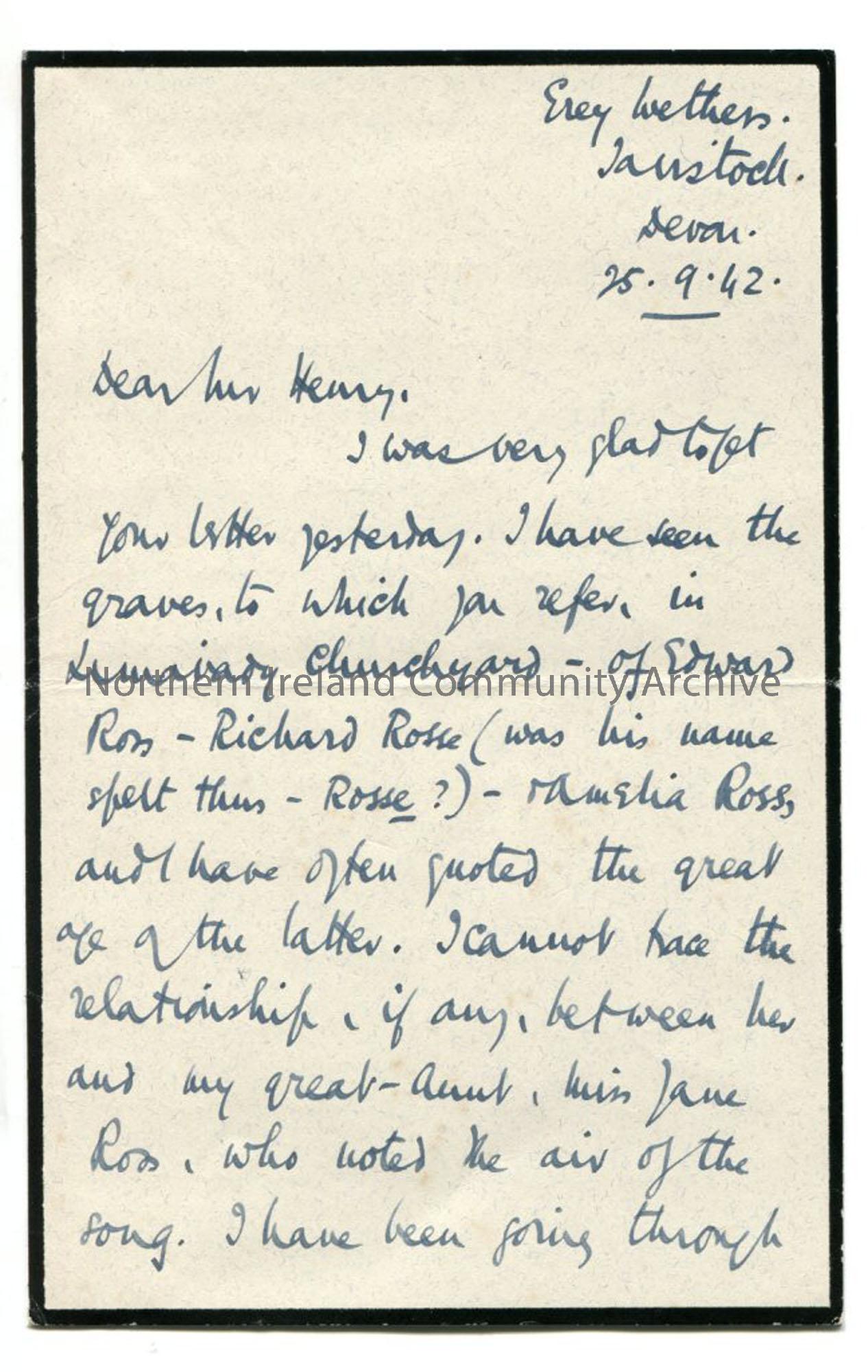Page one of handwritten letter from Rev Trelawney-Ross, re: history of Ross family. Mentions having to move house several times during WWII. Wants Limavady Corporation records in his keeping to be placed with PRONI. Dated 25.9.1942.