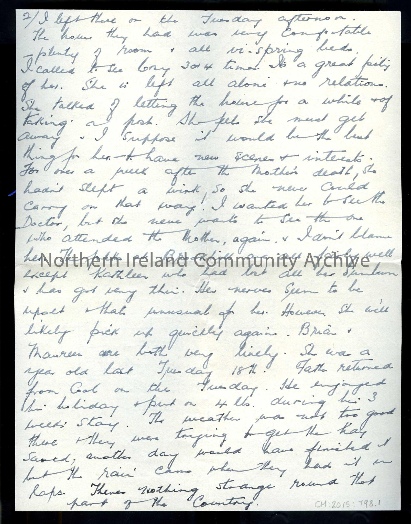 Page one of two – Addressed to Bill (William) from Tillie and father. Sent from Bangor and dated 21.8.1942. Writes about her holiday to Portrush, abou…