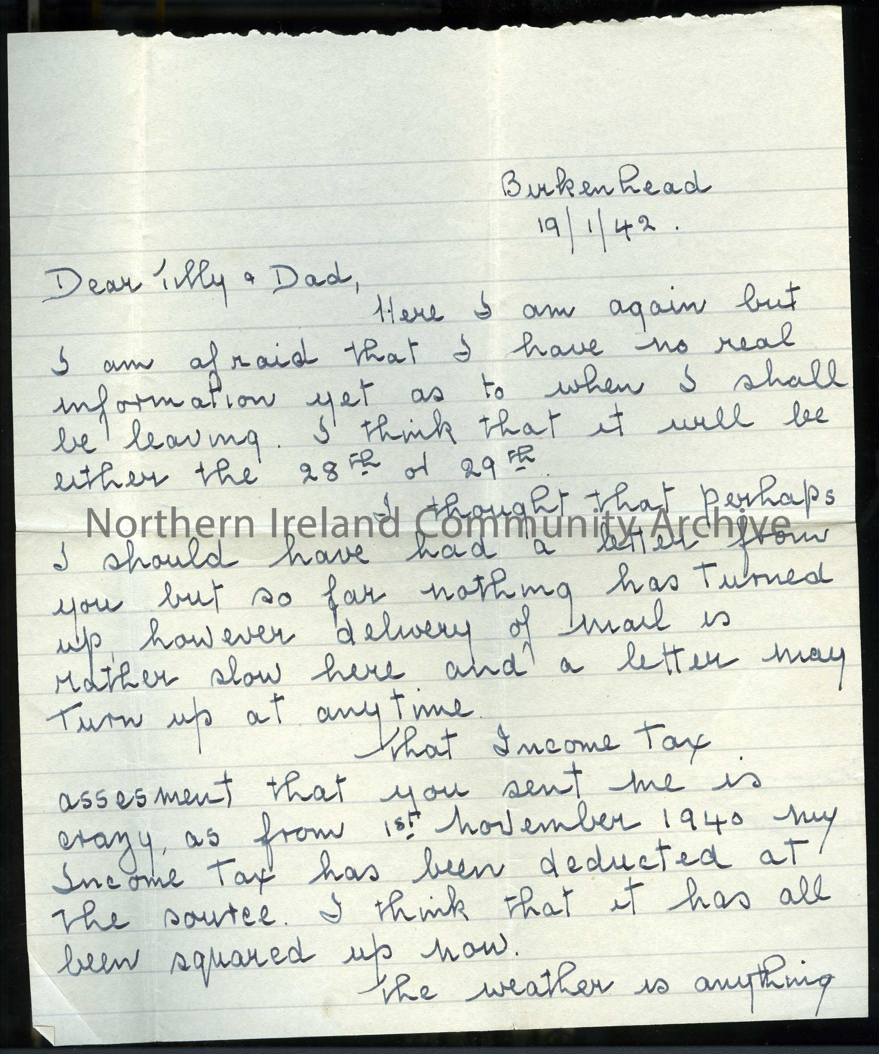 Page one of two - Addressed to Tilly and Dad from Bill (William). Sent from Birkenhead, 19th January 1942. Writes that he thinks he will be leaving on 28th or 29th. He had expected a letter from them but hadn't received anything. Mentions income tax and that he must write to Jack (brother). A section of the letter has been cut out.