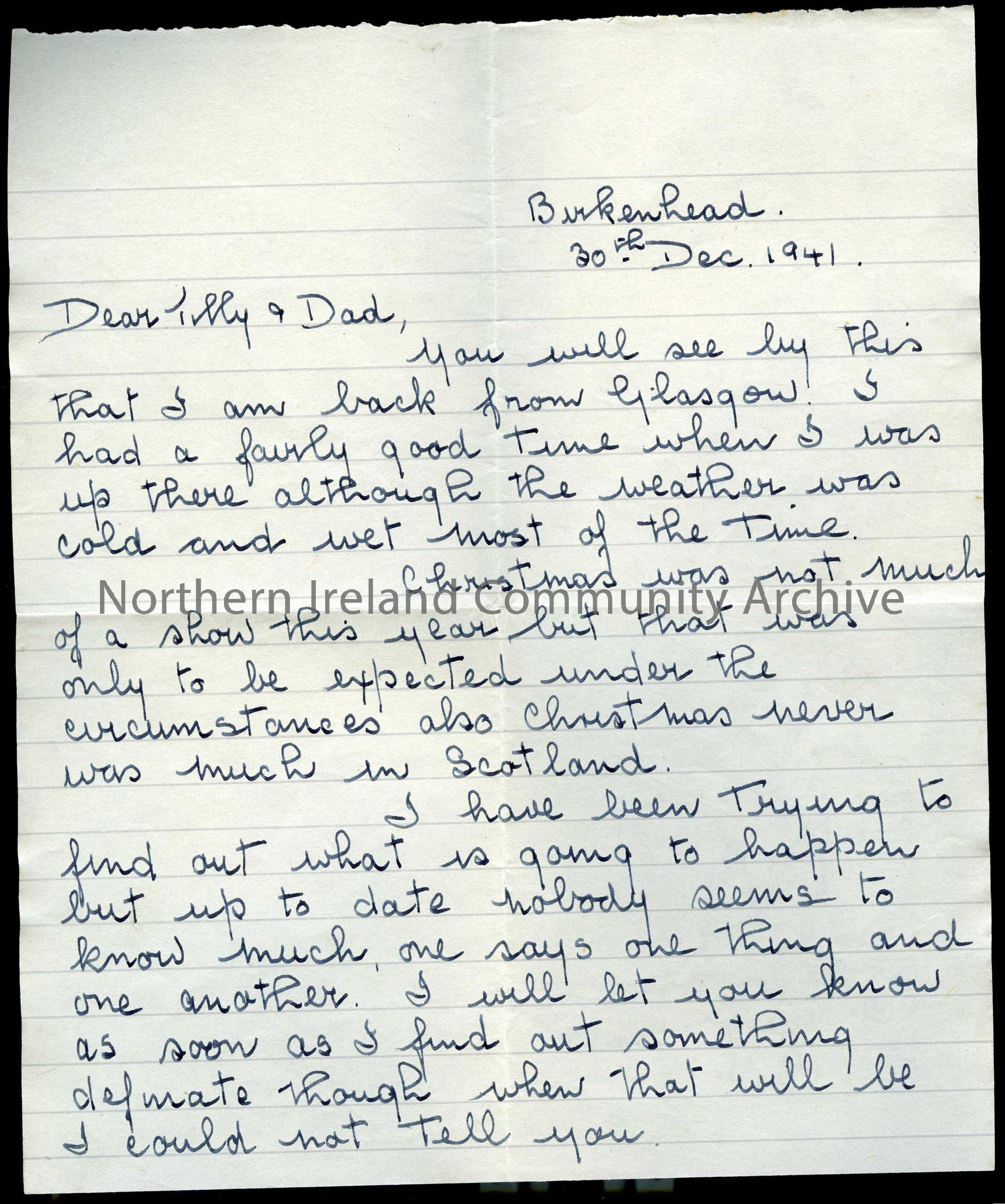 Page one of two - Addressed to Tilly and Dad from Bill (William). Sent from Birkenhead, 30th December 1941. Writes about Christmas and his brother Jack. Asks them to write to S/S Clan Ross, Liverpool and writes that he has attended to income tax form.