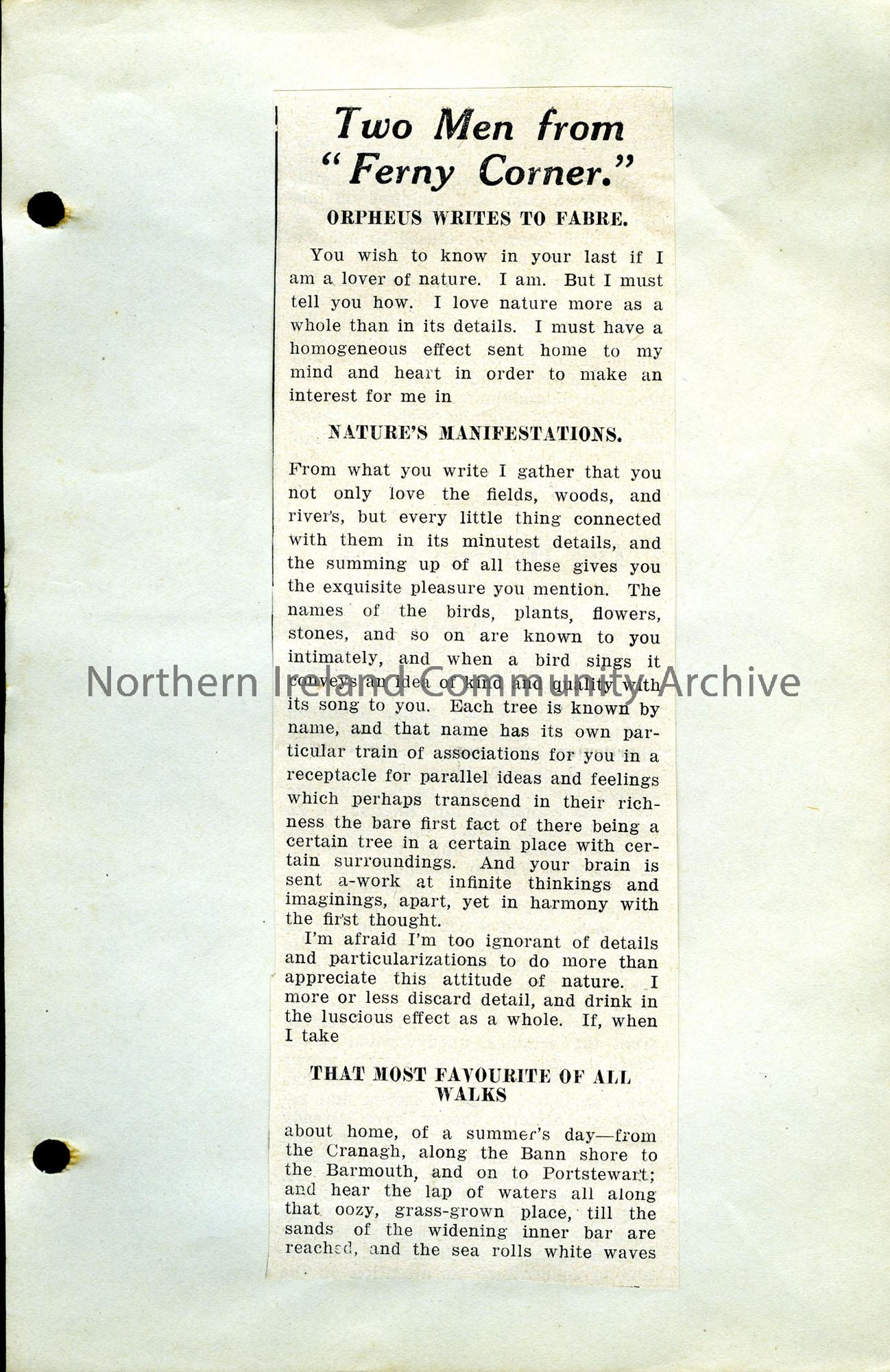 Page one of two, article cut out and stuck to paper titled, 'Two Men from "Ferny Corner", Orpheus Writes to Fabre'. Orpheus tells of his love of nature as a whole rather than particular details. He describes of his love of his walk along the Bann from the Cranagh to Portstewart.