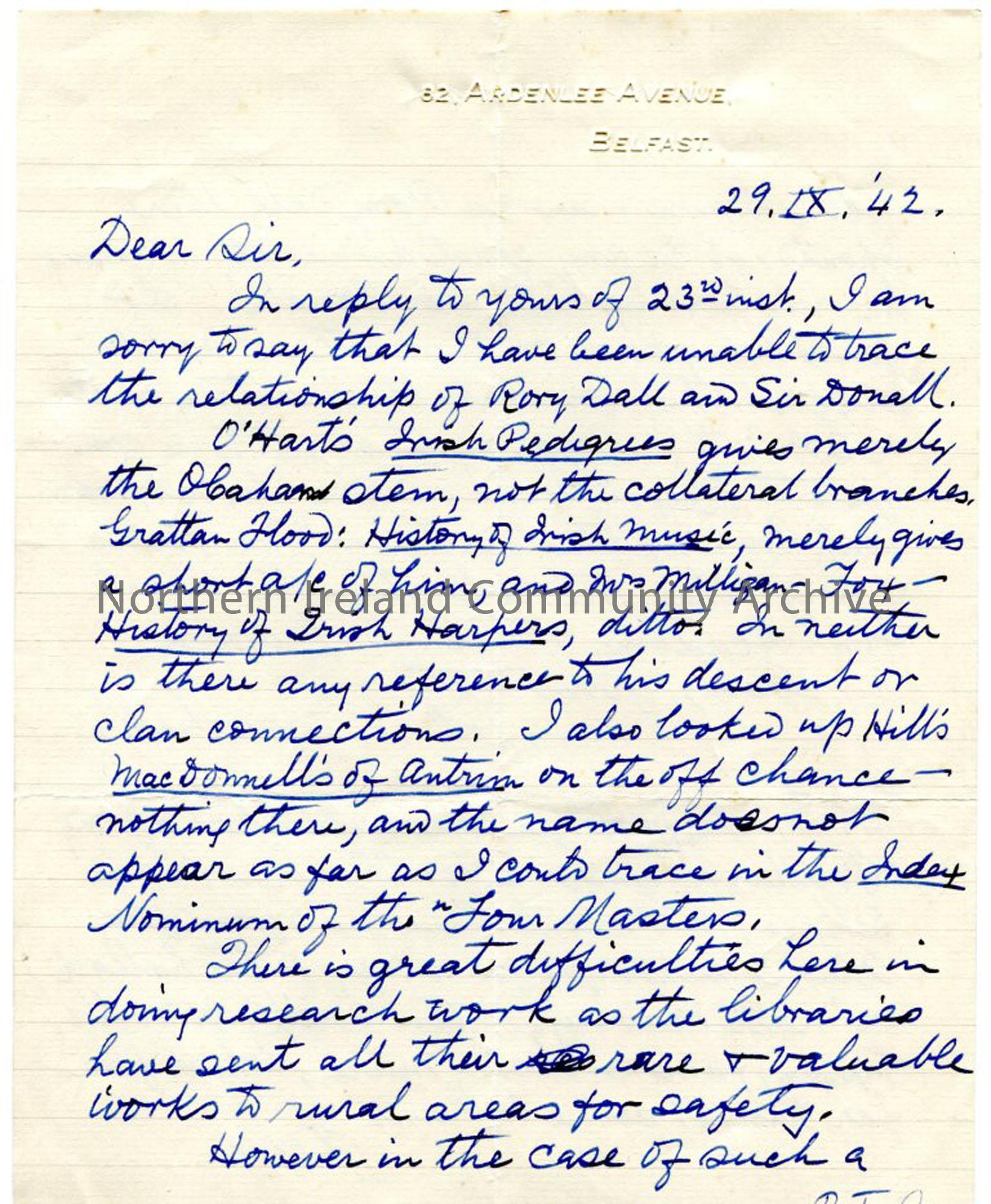 Page one of two - Handwritten letter from John Marshall re: background history for Rory Dall and any clan connection. Also song exchange. 29.9.1942.