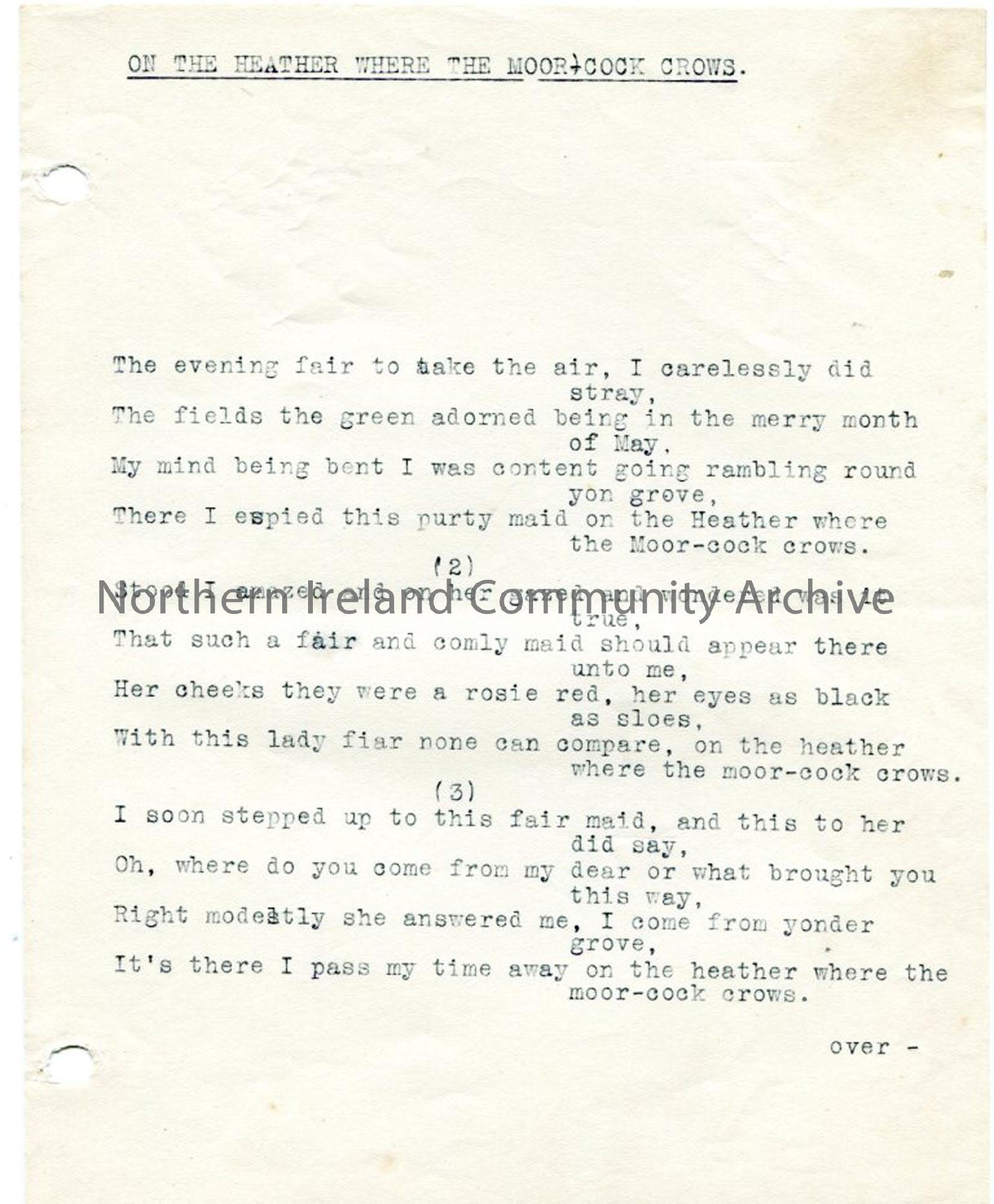 Page one of two pages – typed words to ‘On the Heather where The Moor-Cock Crows’