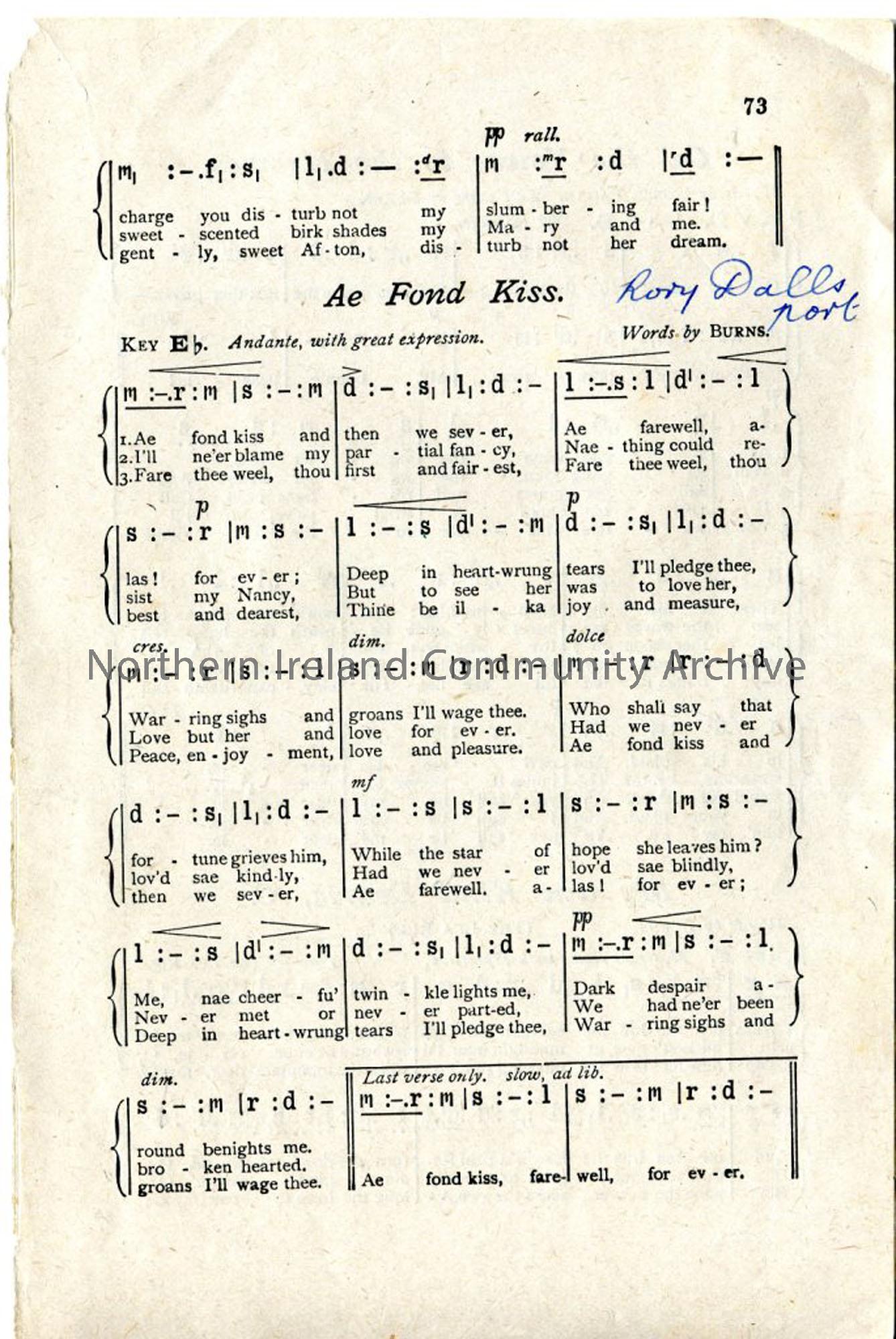 Page one of two – Printed words and tonic sol-fa notation, for poems by Robert Burns – ‘Ae Fond Kiss’, ‘My ain Kind Dearie, O’ and ‘Ca’ the Yowes to the Knowes’