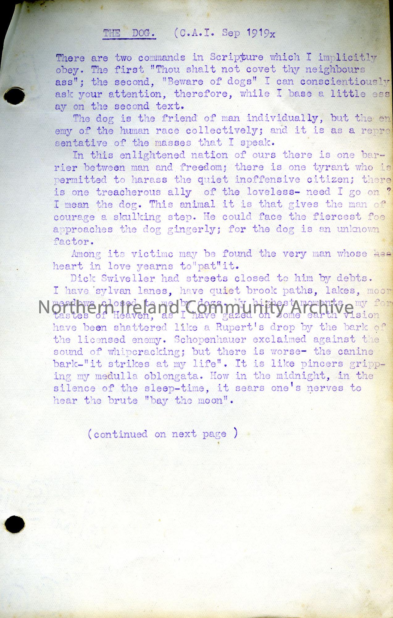 page one of two. Typed document by Sam Henry titled, ‘The Dog (C.A.I. Sep 1919x’. Article in which Sam writes about his dislike of dogs.