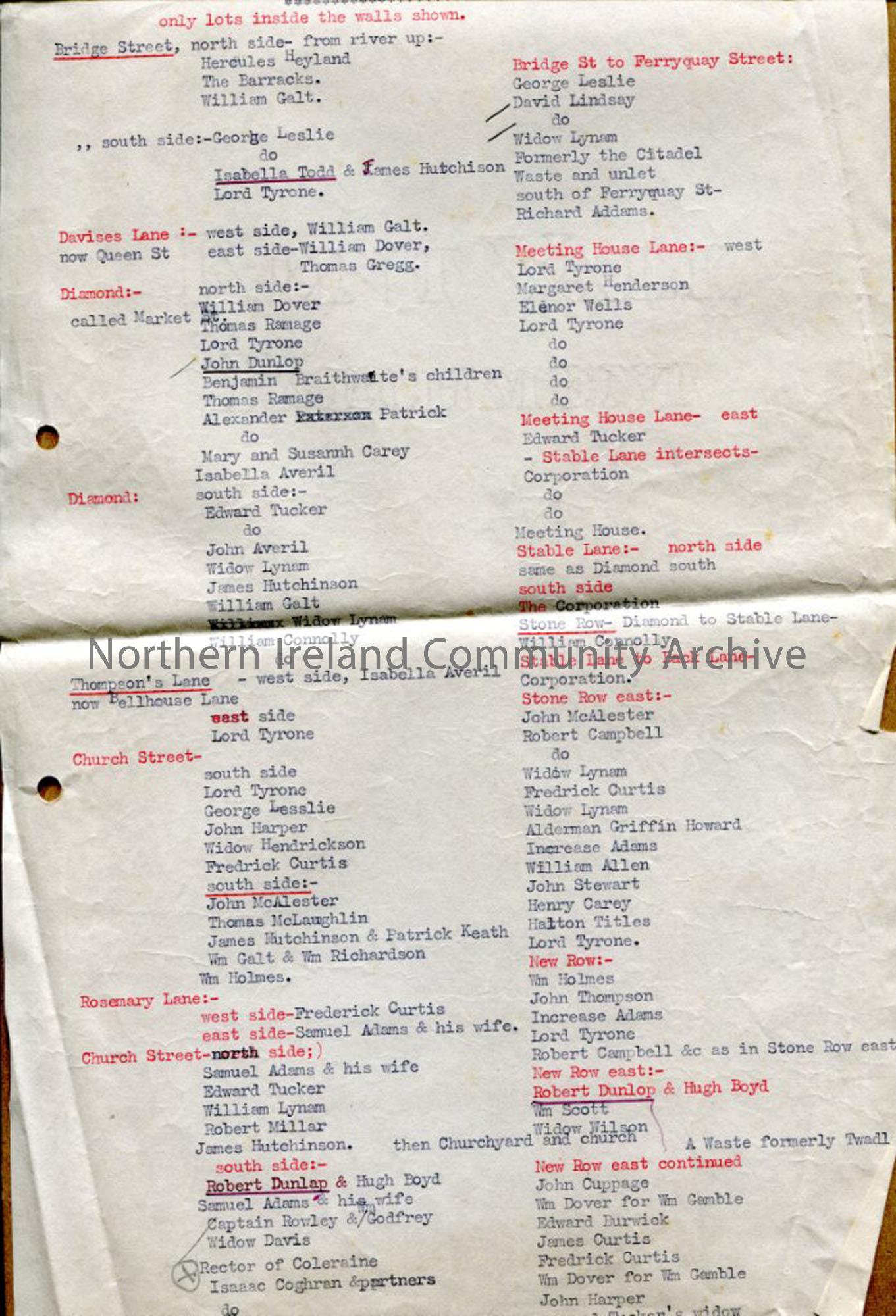 One of 2 pages of typed notes relating to Archibald Stewart's 1758 map of Coleraine town lots - names of tenants. Frank Hunter supplied the map which Sam took information from.