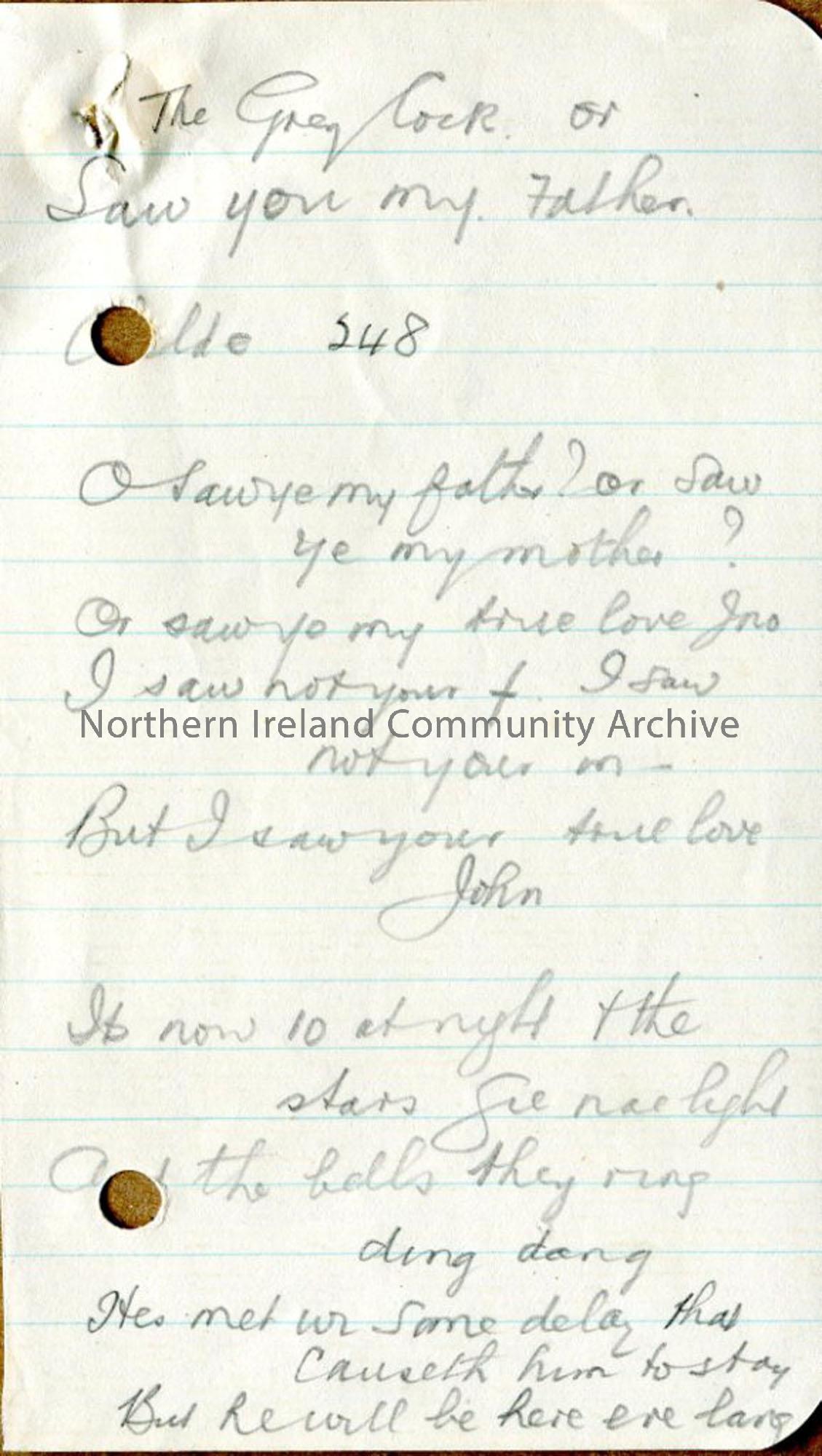 Page one: handwritten words to 'The Grey Cock or Saw you my Father'. Uses local dialect.
