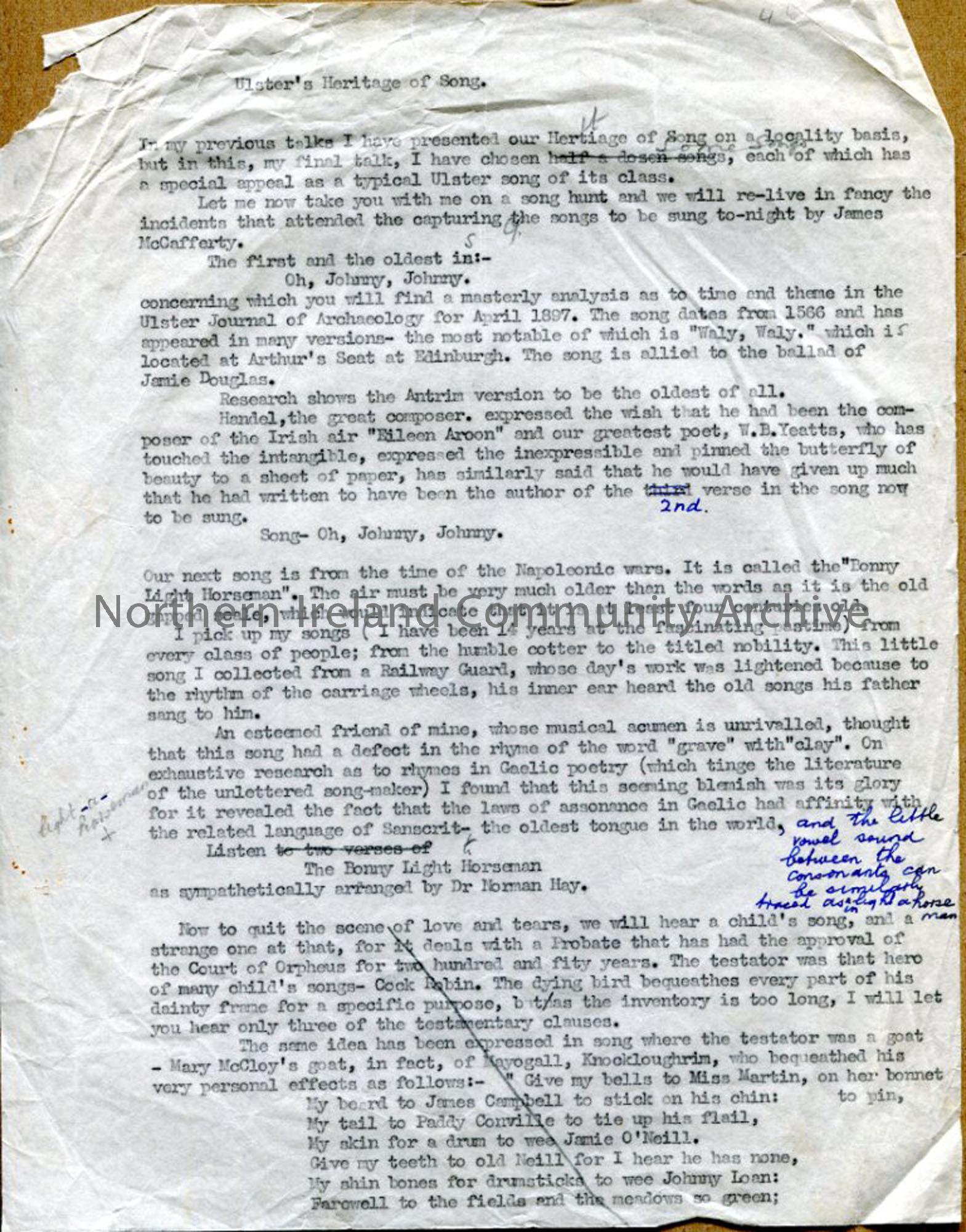 One of 3 typed pages of script for talk/?broadcast, under heading 'Ulster's Heritage of Song' - about different types of old songs, their background (including Ulster Scots links), how he captured them - e.g page 2 - song from listener Archie McEachran in Cantyre (Kintyre), who had before contributed many songs 'of a folk music that Argyle and Antrim shared'. Uses local dialect.