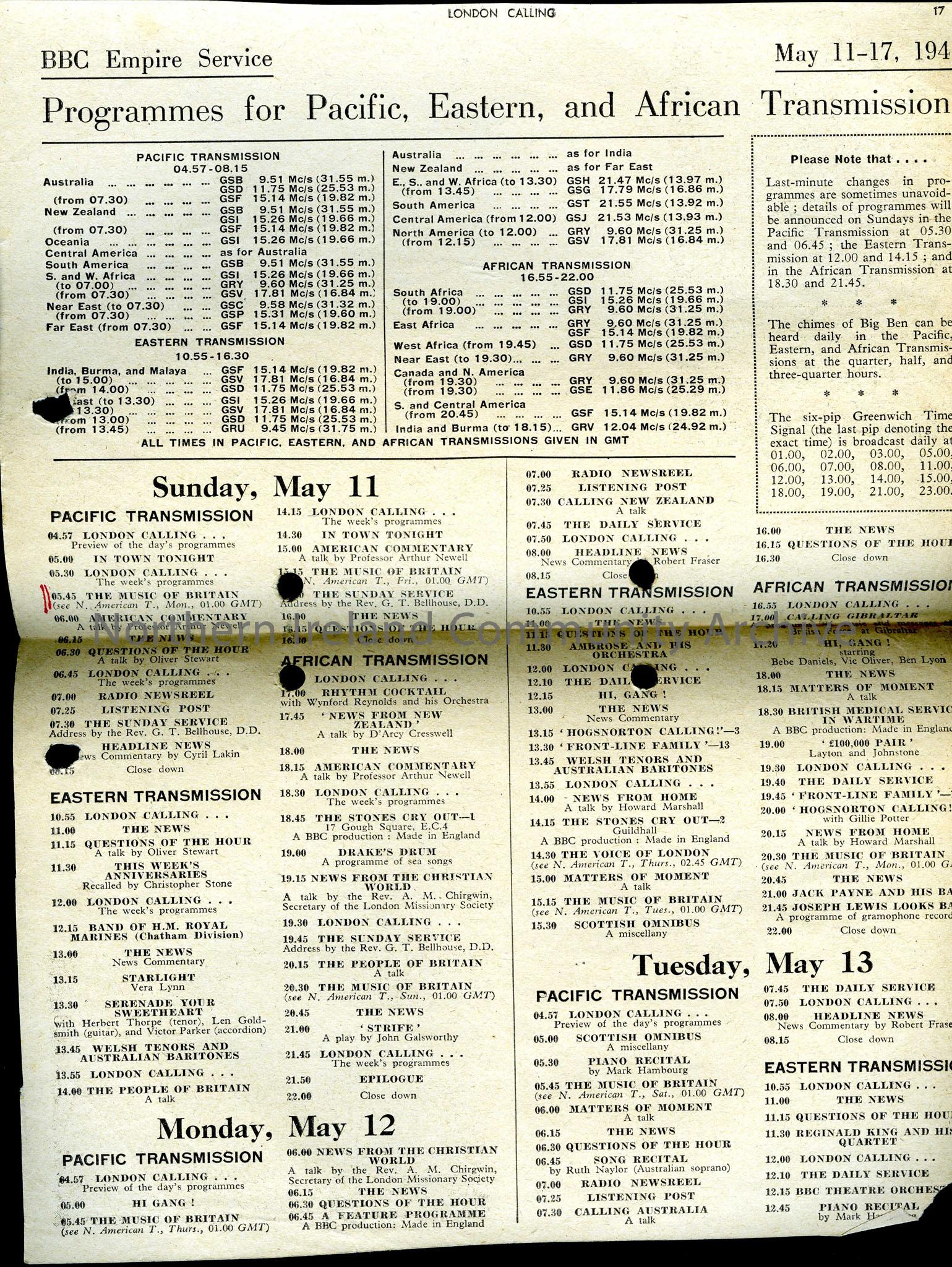 Page removed from 'London Calling'. BBC radio programmes for Sunday 11th May - headed 'Pacific Transmission'. Marked in red is Sam's programme - 'The Music of Britain, (See N. American T., Mon., 01.00 GMT)