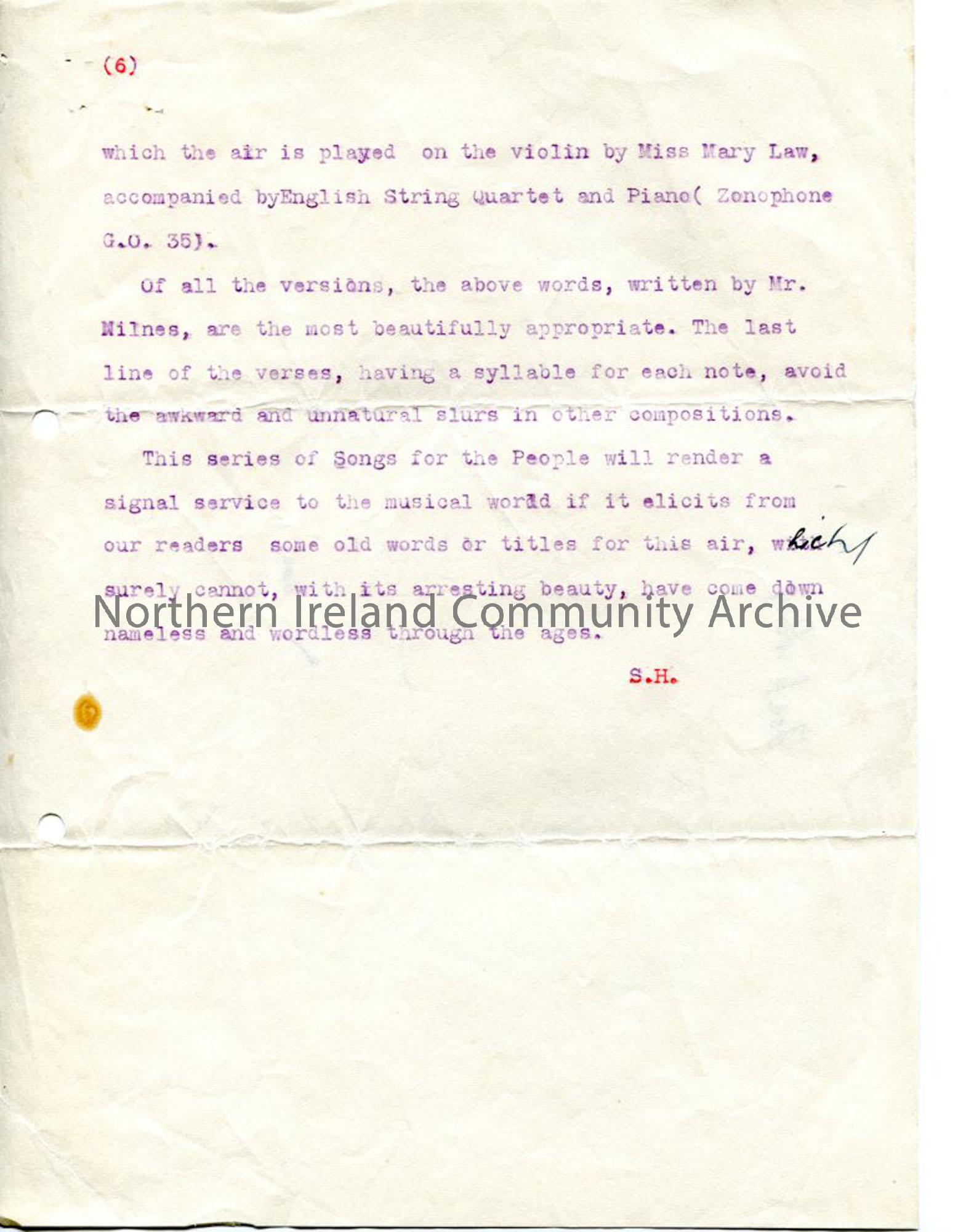 One of 6 pages of typed script under the heading 'Songs of the People' - either for broadcast or for newspaper column 'Songs of the People' - about the 'Londonderry Air', the many songs sung to it, what the original might have been and what the best one is.