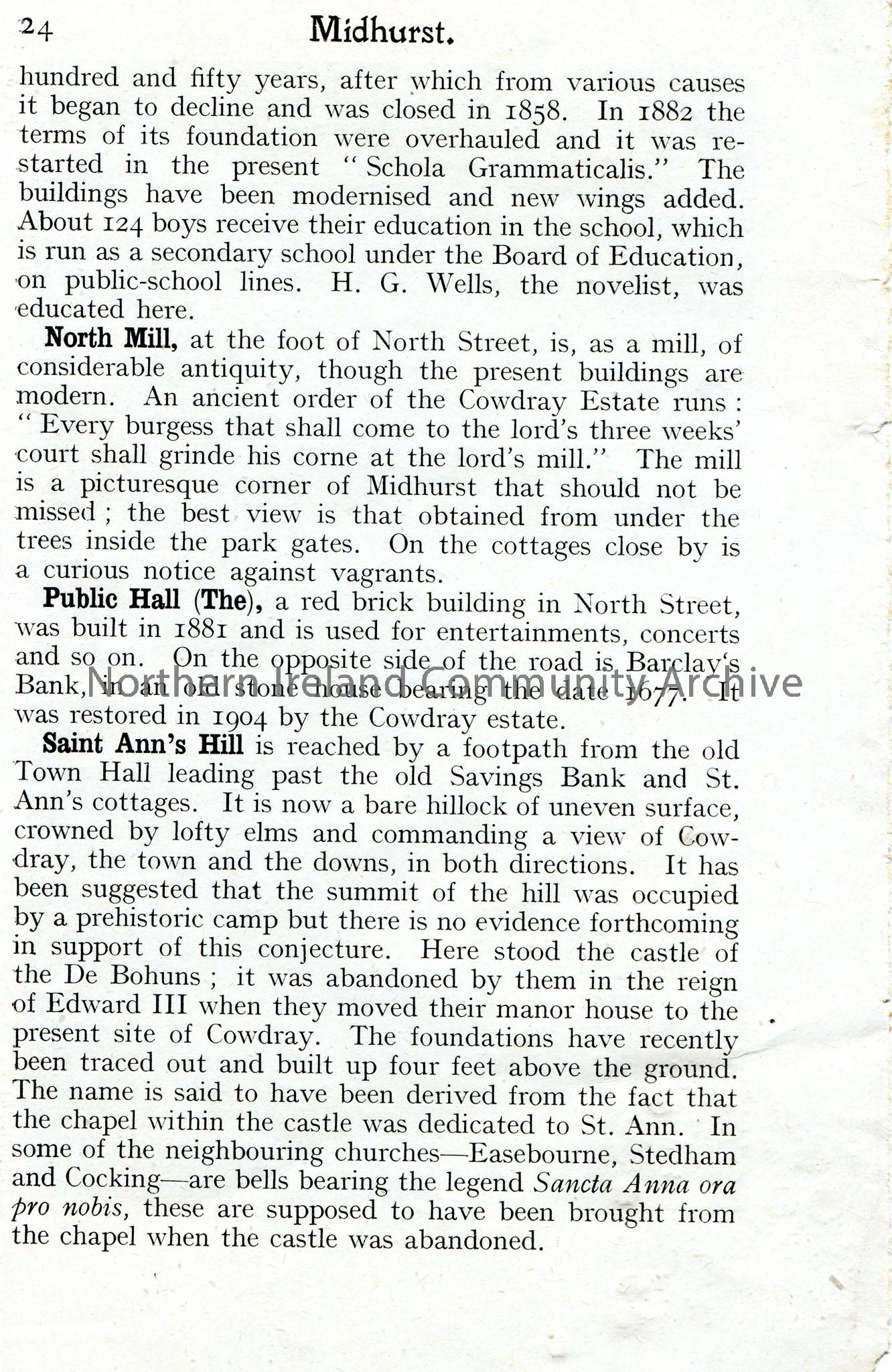 Page taken from a book or publication re Midhurst. One side has a photographic image of a house and gardens captioned, 'Cowdray House'. The other side discusses the North Mill, the Public Hall and Saint Ann's Hill.