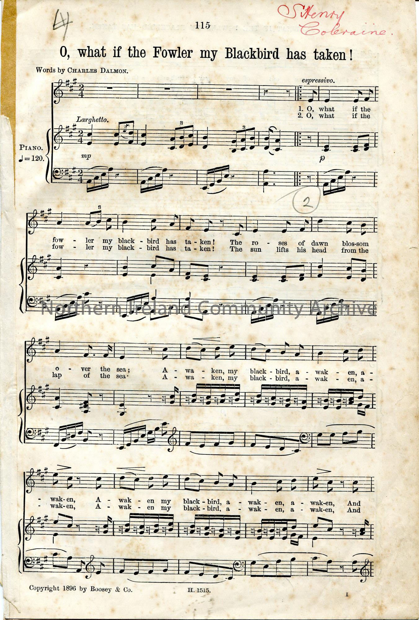 Page taken from a manuscript of music. Copyright 1896 by Boosey & Co. Notes and words to songs 'O, What if the Fowler my Blackbird has taken!' and 'Gwendolen'. 'S. Henry Coleraine' handwritten at top of page.