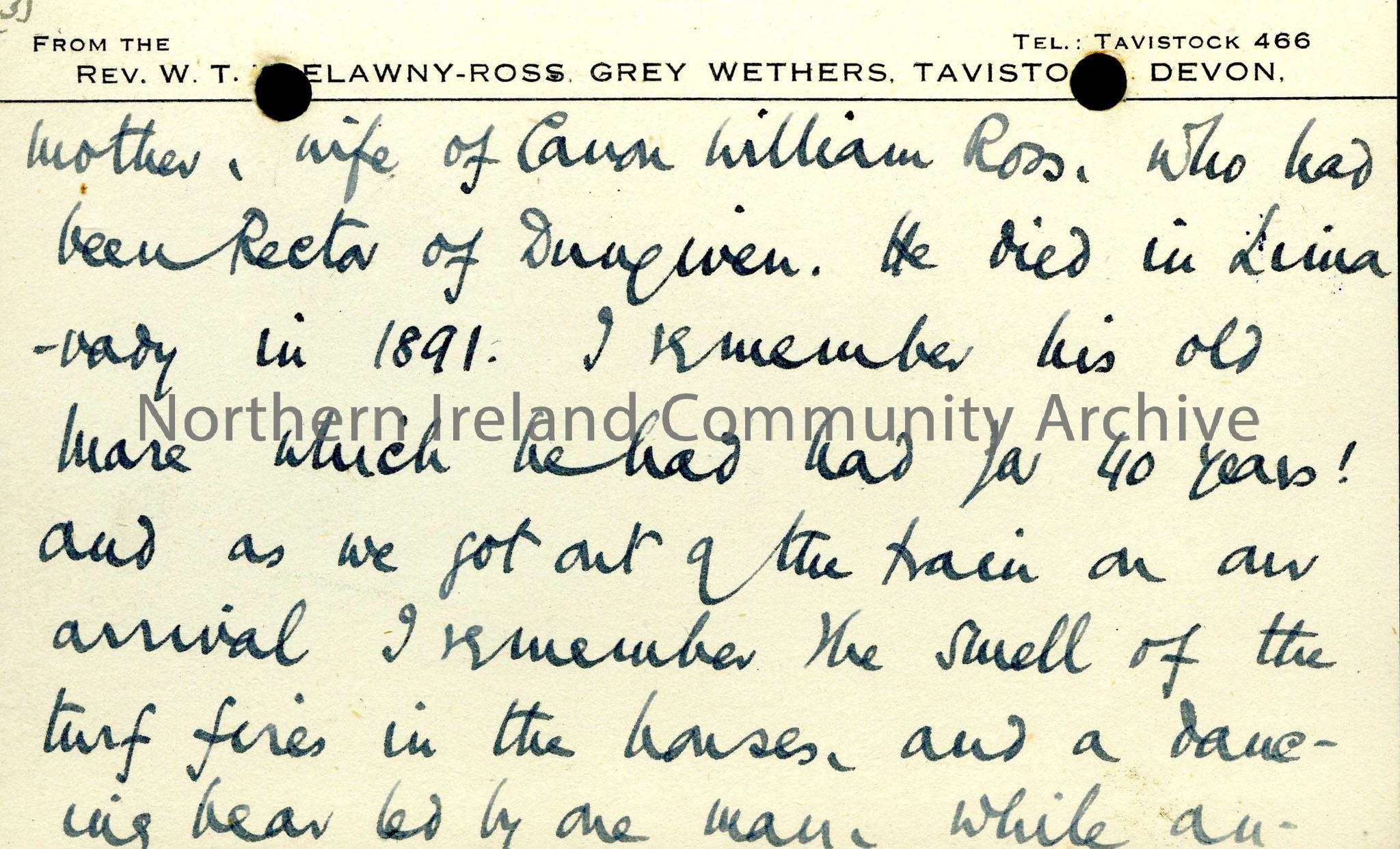 Page three of a card sent by the Rev. W. T. Trelawny-Ross in which he reminisces about his visit to Limavady in 1889 after the death of his grandmothe… – Scan988