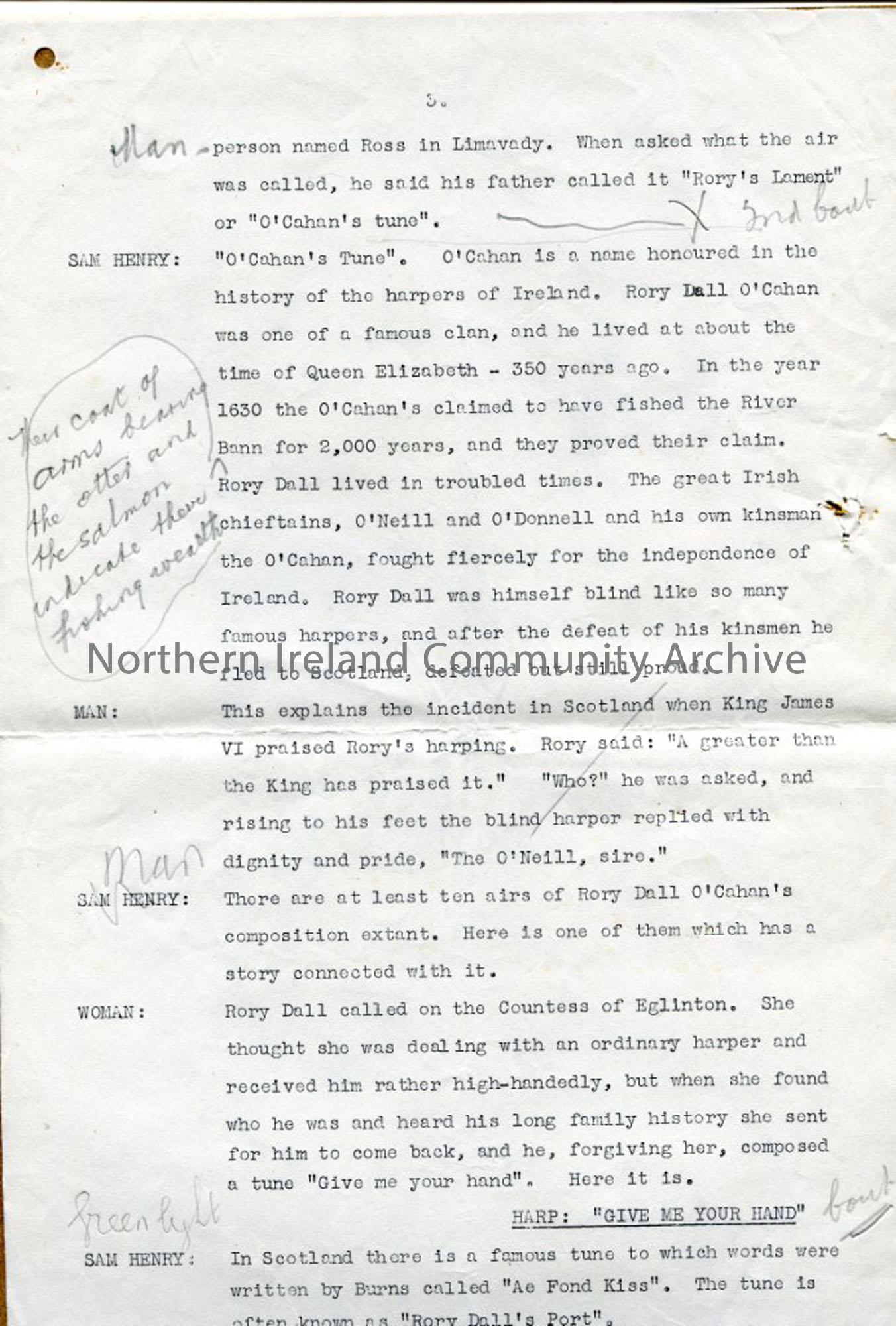 Page three of four pages - script for broadcast 'Who wrote the Londonderry Air?', with biographical and historical information [including Scottish element] and including speech direction for 'man', 'woman' and Sam Henry.