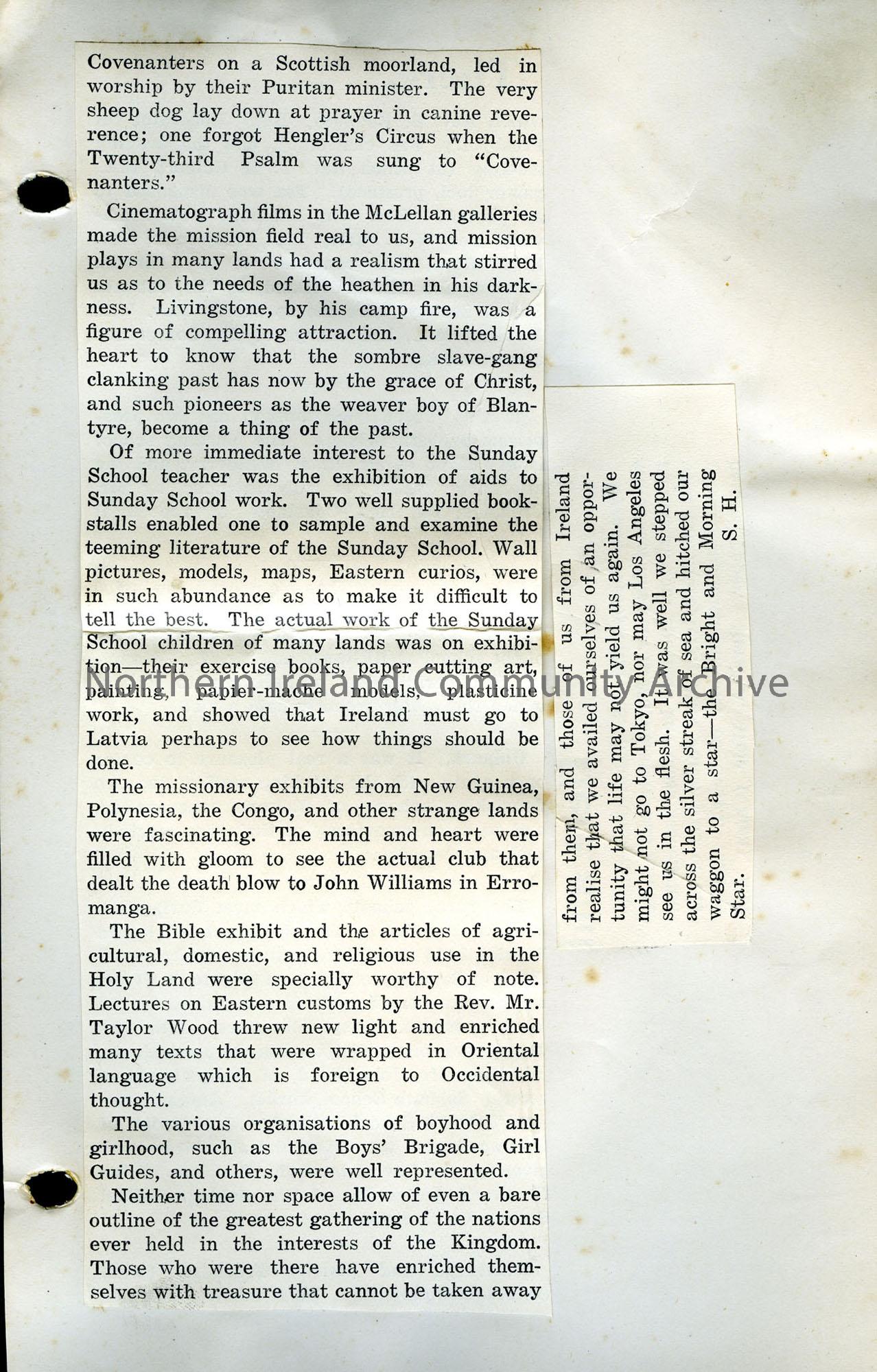 page three of three. typed document by Sam Henry titled, 'Impressions of the World's Sunday School Convention'. Details a religious Convention which took place in St. Andrew's Hall, Glasgow with a crowd of 5000 people.