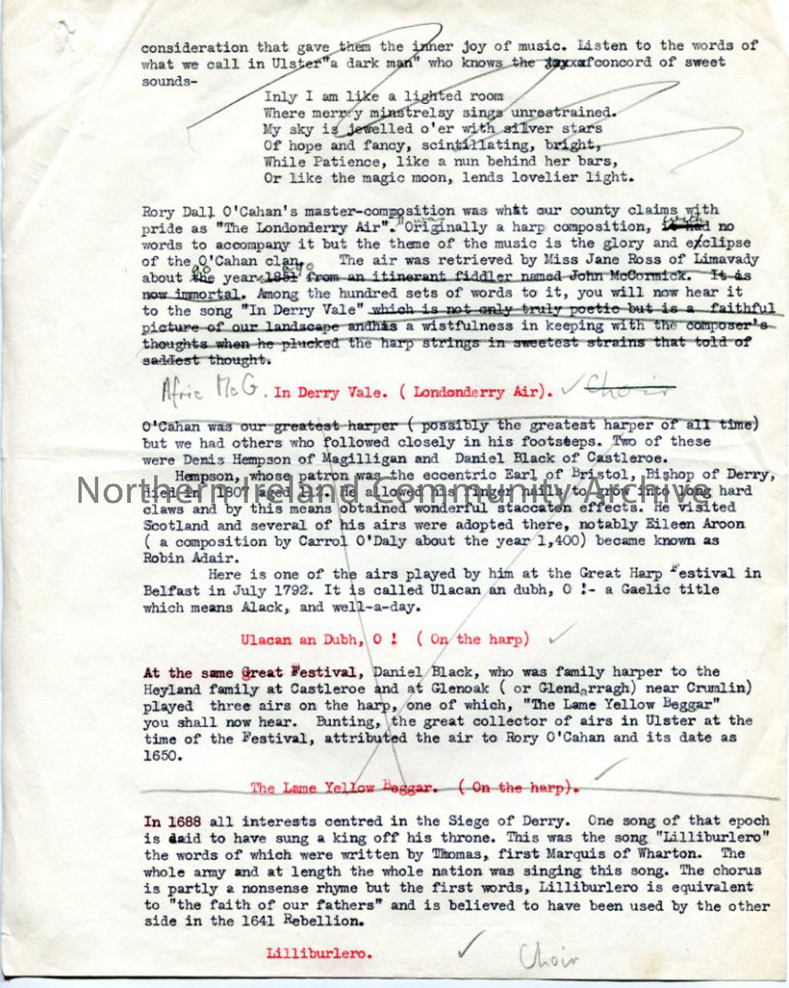One of 4 typed pages and small attached typed note - 'The Music of County Londonderry'. Appears to be rough, corrected script for broadcast, giving history from ancient times, with song titles for singing/playing interspersed at intervals. Includes Rory Dall O'Cahan, the blind harper.