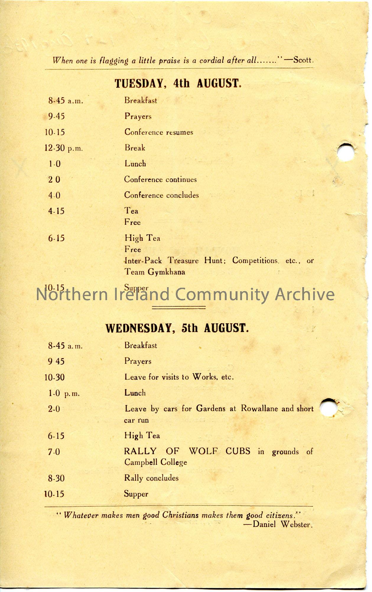 Page torn from a booklet. '1st National Old Wolves? gathering Belfast 1-7 Aug 1936 handwritten across top of page. X marked at Sam Henry's name for a lecture 'The Glory that was Ulster'.