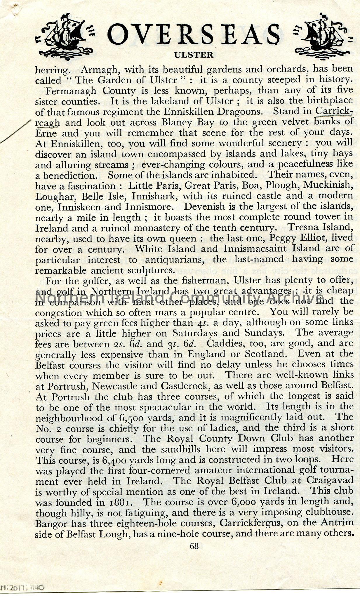 Page torn from book titled 'Overseas Ulster'. Numbered pages 67-68. Photographic image of a town and landscape captioned 'Enniskillen, Co. Fermanagh, Ulster'. Information re the counties of Armagh and Fermanagh. Carrickreagh is underlined in pencil.