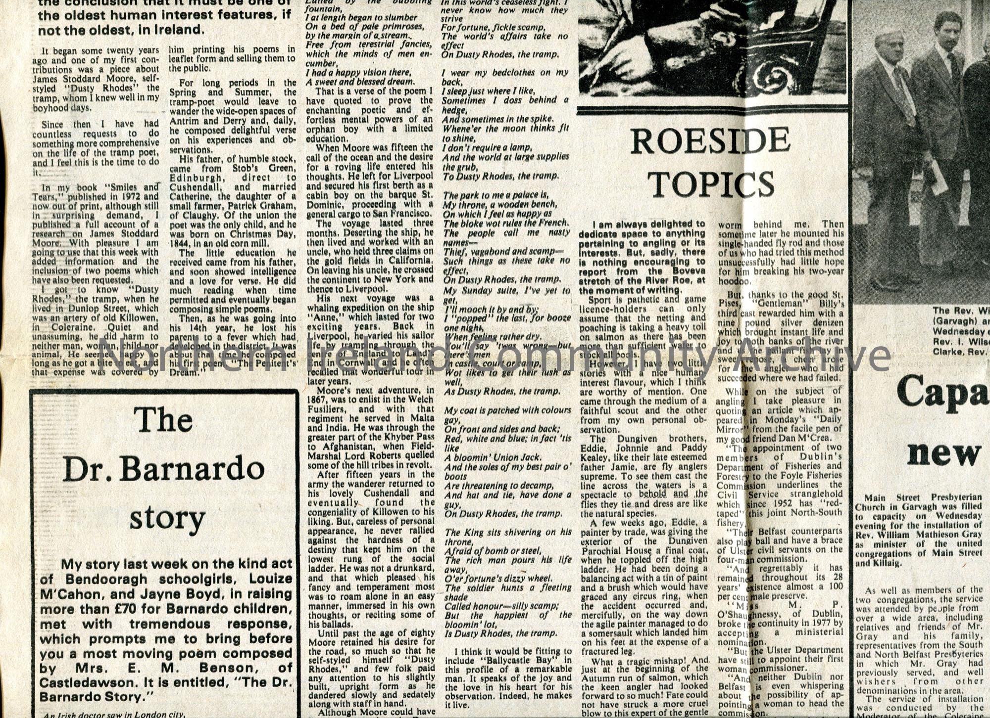 Page torn from 'The Chronicle' newspaper of 27th September, 1980. 'People & Places' feature by W. 'Speedy' Moore. Article he has written titled, 'James Stoddard Moore'. Re the well known tramp and poet Dusty Rhodes. Features poetry by Dusty Rhodes and image.