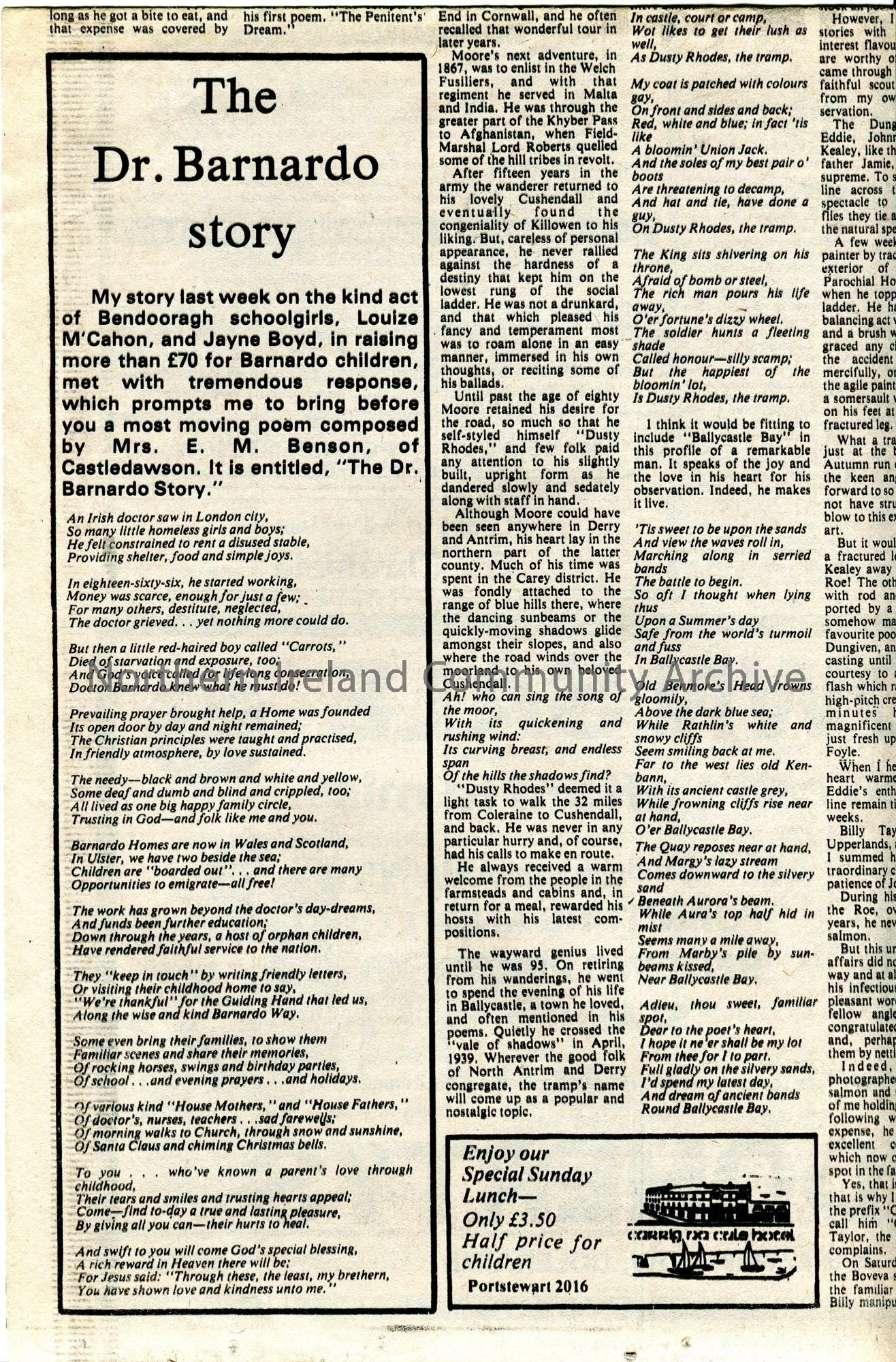 Page torn from 'The Chronicle' newspaper of 27th September, 1980. 'People & Places' feature by W. 'Speedy' Moore. Article he has written titled, 'James Stoddard Moore'. Re the well known tramp and poet Dusty Rhodes. Features poetry by Dusty Rhodes and image.