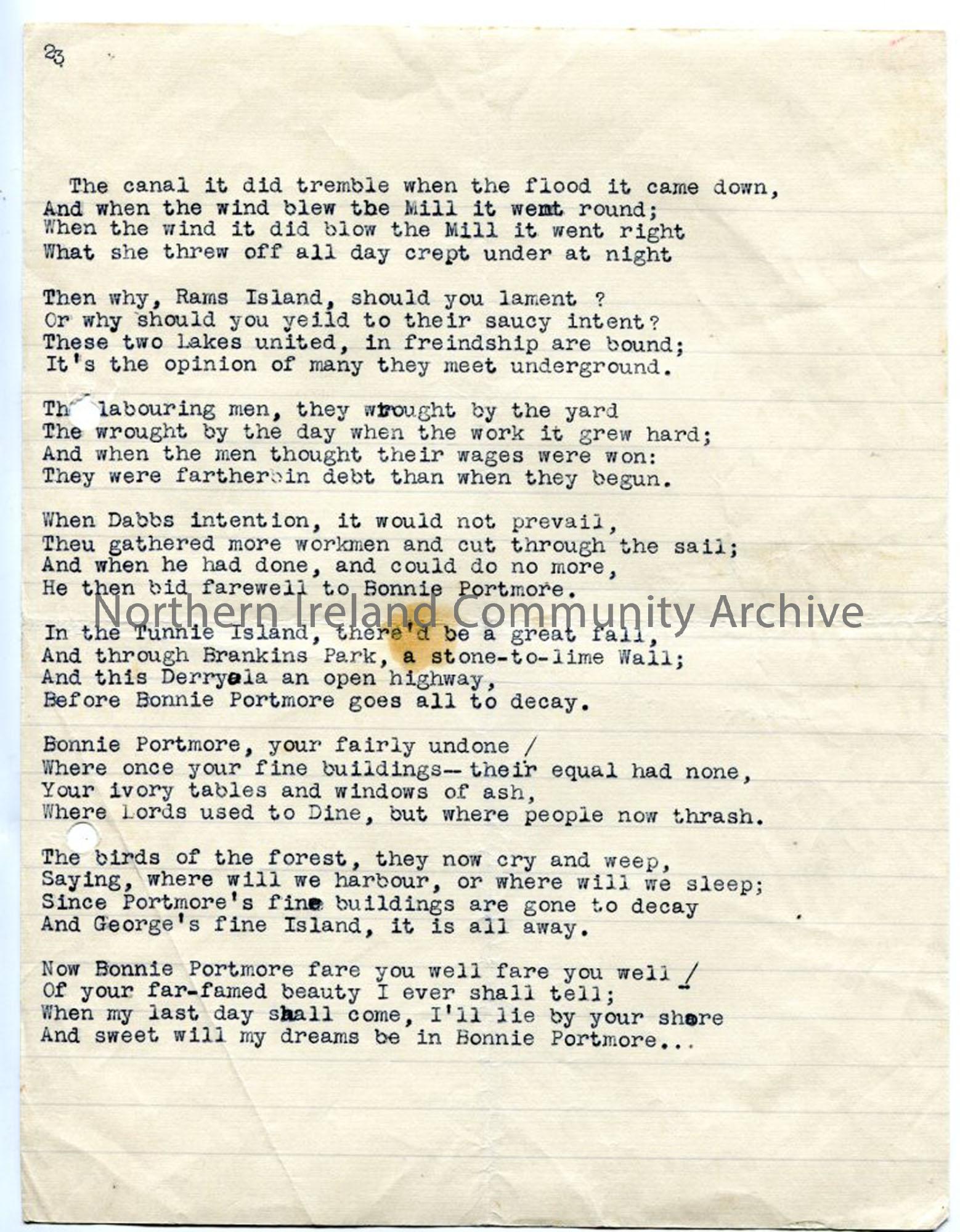 Page two: Typed words to 'Bonnie Portmore' - mentions Rams Island, Deerpark, the Tunnie (cut between Portmore Lough and Lough Neagh).
