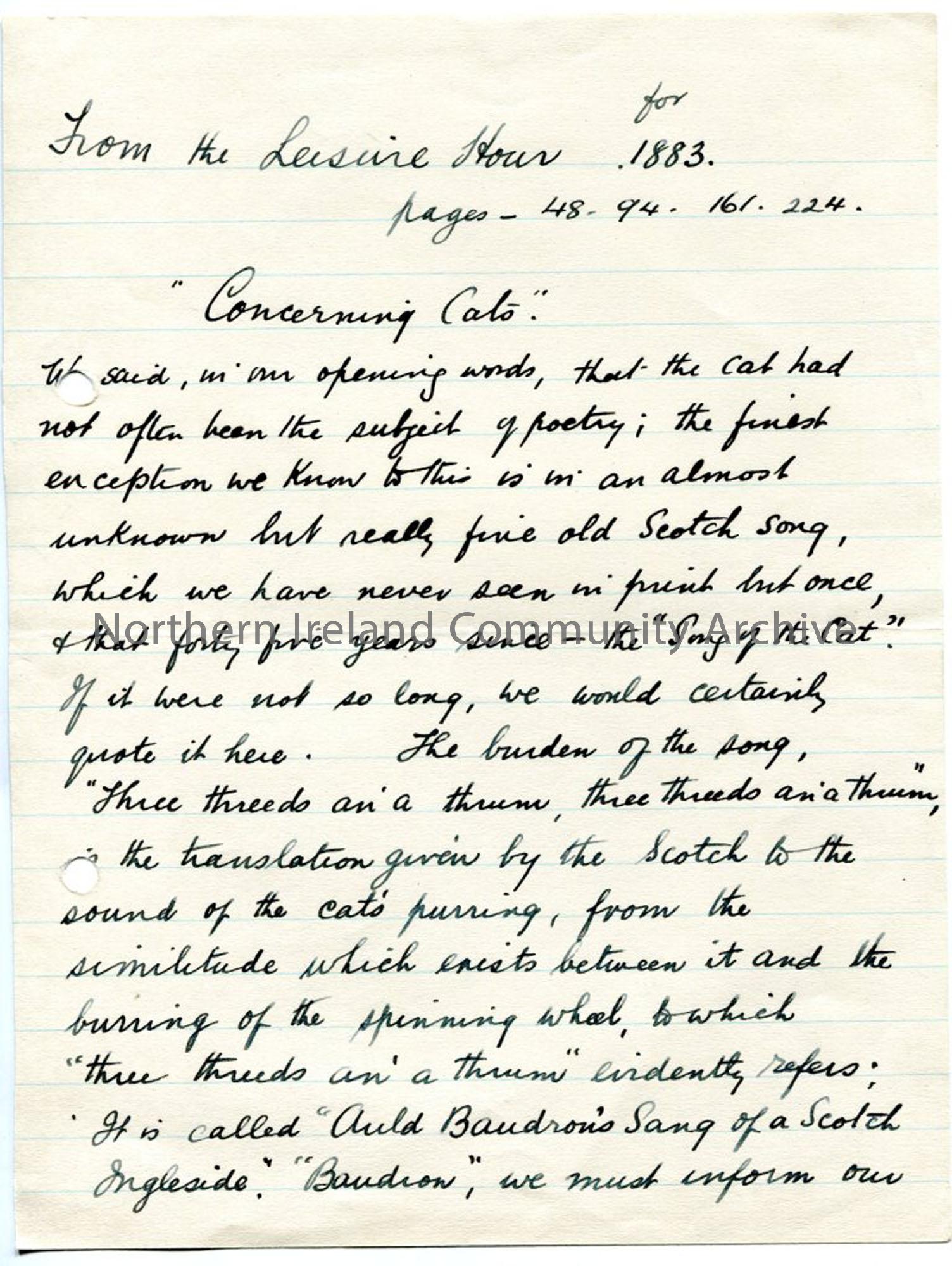 Page two: handwritten letter re: a Scottish song - 'The Song of the Cat', including copied extract from a bound journal, which discusses the 'burden' of the song being Scotch translation. From A M Irwin, Portballintrae, dated 12.1.1940.