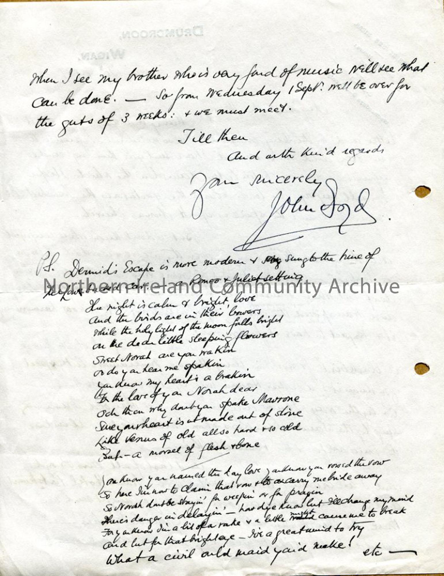 Page two: Handwritten letter thanking Sam for song received and giving information re: others, including words to 'Dermid's Escape'. From John Boyd in Drumcroon, Wigan and dated 30.8.1937.