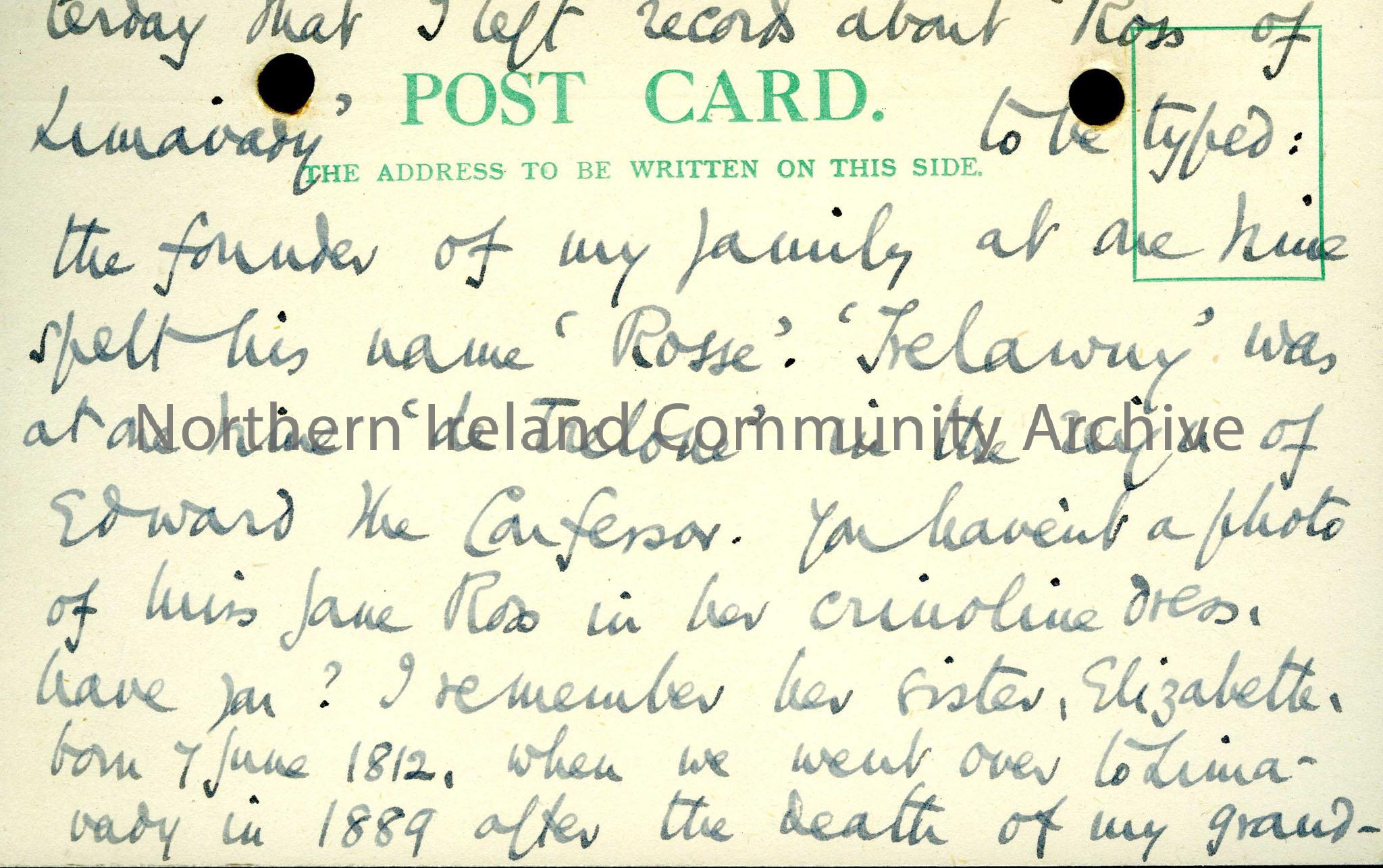 Page two of a card sent to Sam thanking him for his article. The Rev. W. T. Trelawny-Ross writes about the spelling of the family name and recalls a visit to Limavady in 1889.