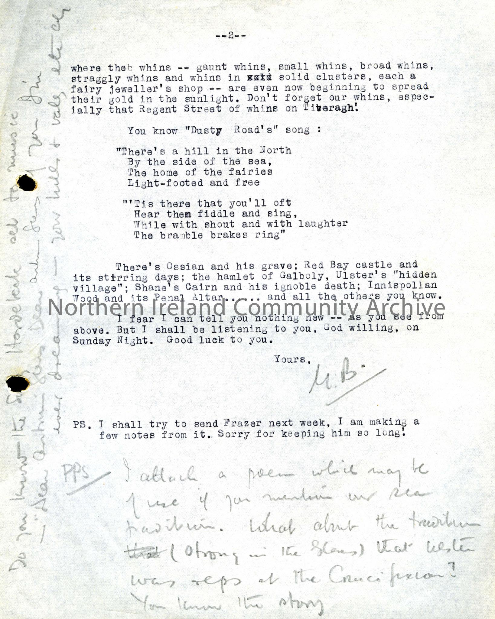 Page two of a letter making suggestions for a broadcast by Sam Henry on the "Glens of Antrim". The writer quotes from a poem by Dusty Roads (Rhodes) and mentions historical sites that could be included in the programme.