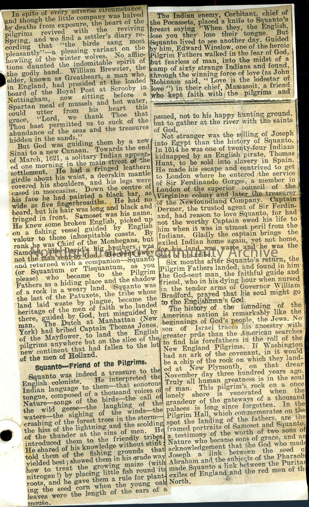 page two of article titled, 'Westward Ho! A Romance of the Faith of the Pilgrim Fathers', by Sam Henry. Subtitles include 'Among the Indians', 'At New Plymouth' and 'Squanto-Friend of the Pilgrims'.