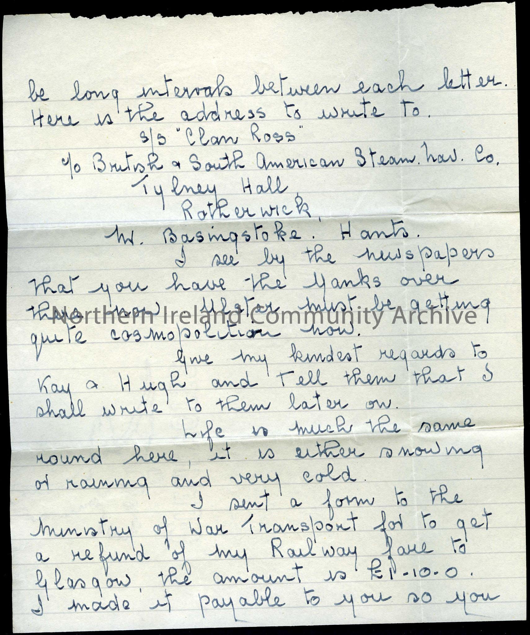 Page two of three - Addressed to Tilly and Dad from Bill (William). Sent from Birkenhead, 28th January 1942. Writes that he has received a letter from Kay but nothing from Jack. They are off today on the same voyage as the last time and Bill advises them to only write about once a month and provides the address to write to. Mentions the 'Yanks' being in Ulster and says that he has recovered from the bomb blast.