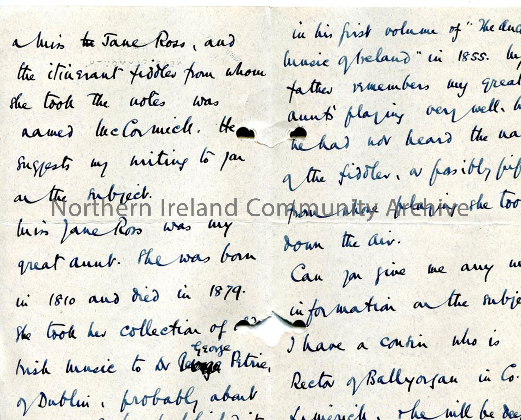 Page two of three: Handwritten letter from Rev W T Trelawney-Ross, nephew of Miss Ross, re: Londonderry Air and McCormick and asking for any information Sam may have. Dated 24.1.1939.