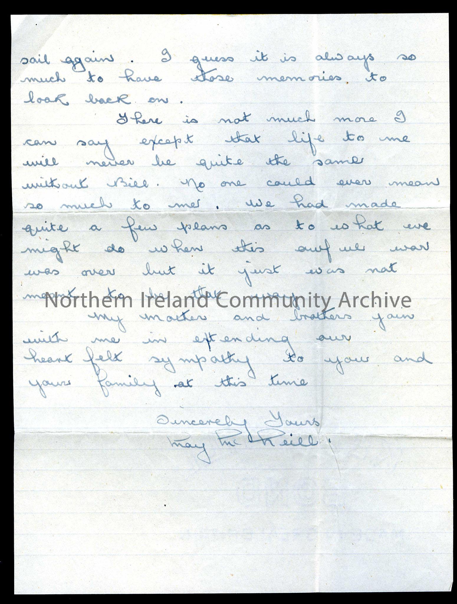 Page two of two - Addressed to Miss McCrory from May McNeill (Bill's girlfriend). Sent from Glasgow and dated 9.11.1942. May writes to thank Miss McCrory for letting her know about Bill - she extends her deepest sympathy to the family and writes that Bill was so very dear to her and that life to her will never be quite the same without Bill.