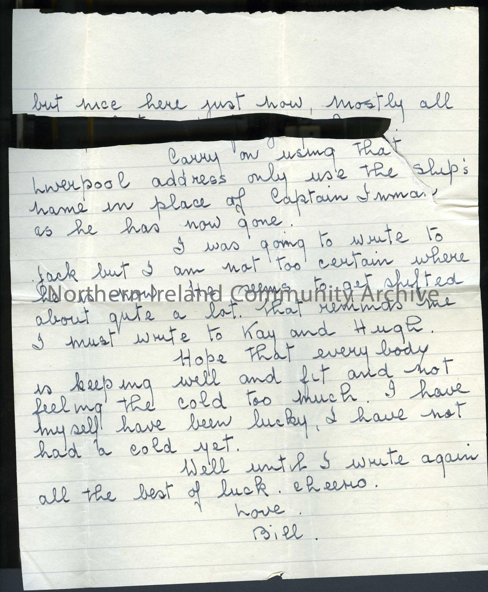 Page two of two - Addressed to Tilly and Dad from Bill (William). Sent from Birkenhead, 19th January 1942. Writes that he thinks he will be leaving on 28th or 29th. He had expected a letter from them but hadn't received anything. Mentions income tax and that he must write to Jack (brother). A section of the letter has been cut out.