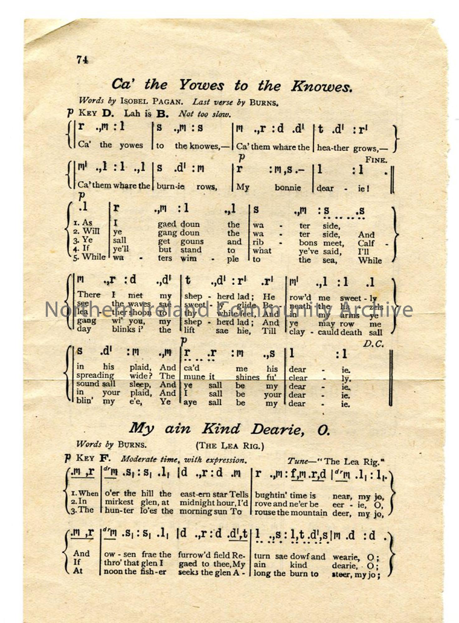 Page two of two – Printed words and tonic sol-fa notation, for poems by Robert Burns – ‘Ae Fond Kiss’, ‘My ain Kind Dearie, O’ and ‘Ca’ the Yowes to the Knowes’