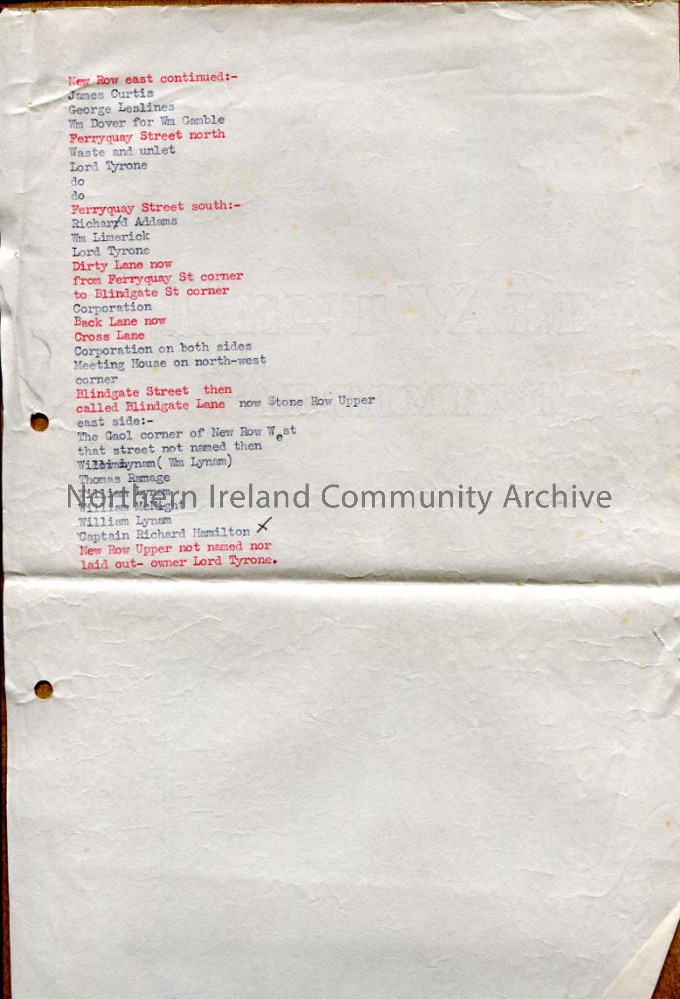 One of 2 pages of typed notes relating to Archibald Stewart's 1758 map of Coleraine town lots - names of tenants. Frank Hunter supplied the map which Sam took information from.
