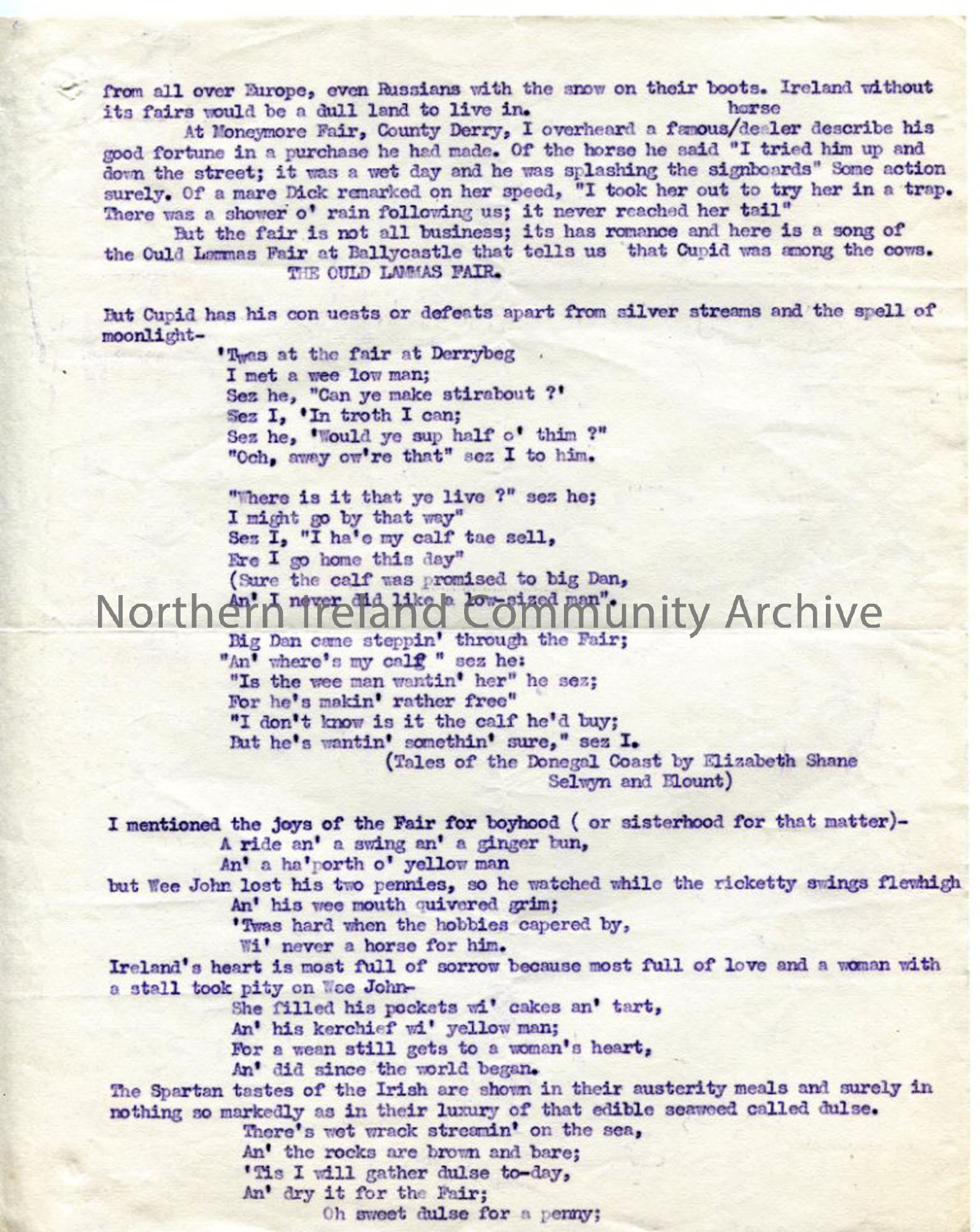 One of 3 typed pages of broadcast script under heading 'Songs of the Fair' - tells of visits to fair, conversations overheard (uses local dialect), songs about, types of fairs.